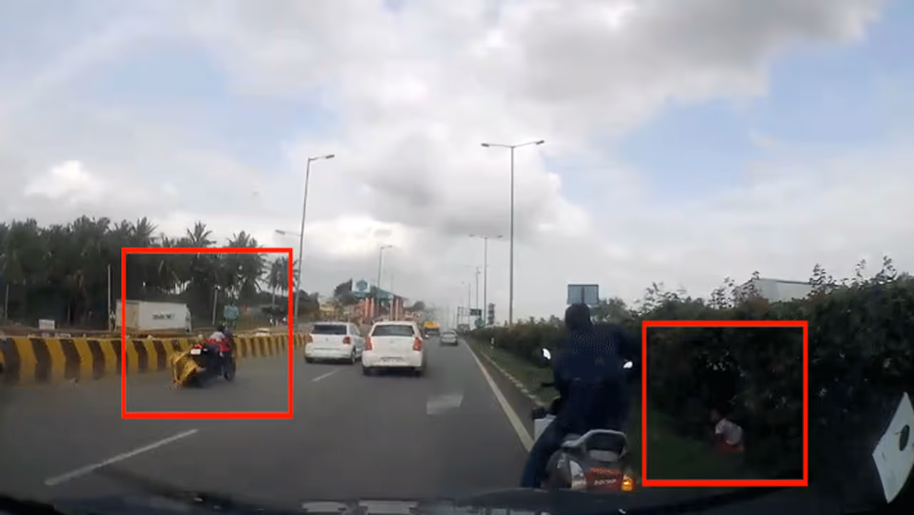 இதில் அந்த குழந்தை ரோட்டின் நடுவில் உள்ள தடுப்பில் கீழே விழுந்தது. அப்போது அந்த தேசிய நெடுஞ்சாலையில் கார், லாரி உள்ளிட்ட வாகனங்கள் சென்றாலும் அந்த மோட்டார் சைக்கிள் மீது மோதவில்லை, குழந்தை தூக்கி வீசப்பட்ட நேரத்திலும் அந்த குழந்தை மீதும் எந்த வாகனங்களும் மோதவில்லை என்பது வியப்புக்குரியது.