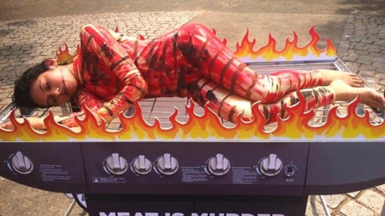 சாலையில், மாதிரி அடுப்பு வைத்து அதில் பெண் ஒருவருக்கு இறைச்சி நிறத்திலும், ரத்தம் வடியும் தோற்றத்திலும் உடை அணிவித்து படுக்க வைத்து இருந்தது. கிரில் சிக்கன் அடுப்பில் வெந்துவருவதைப் போல் அந்த பெண் படுத்து இருந்தார்.