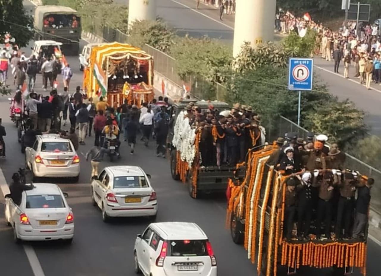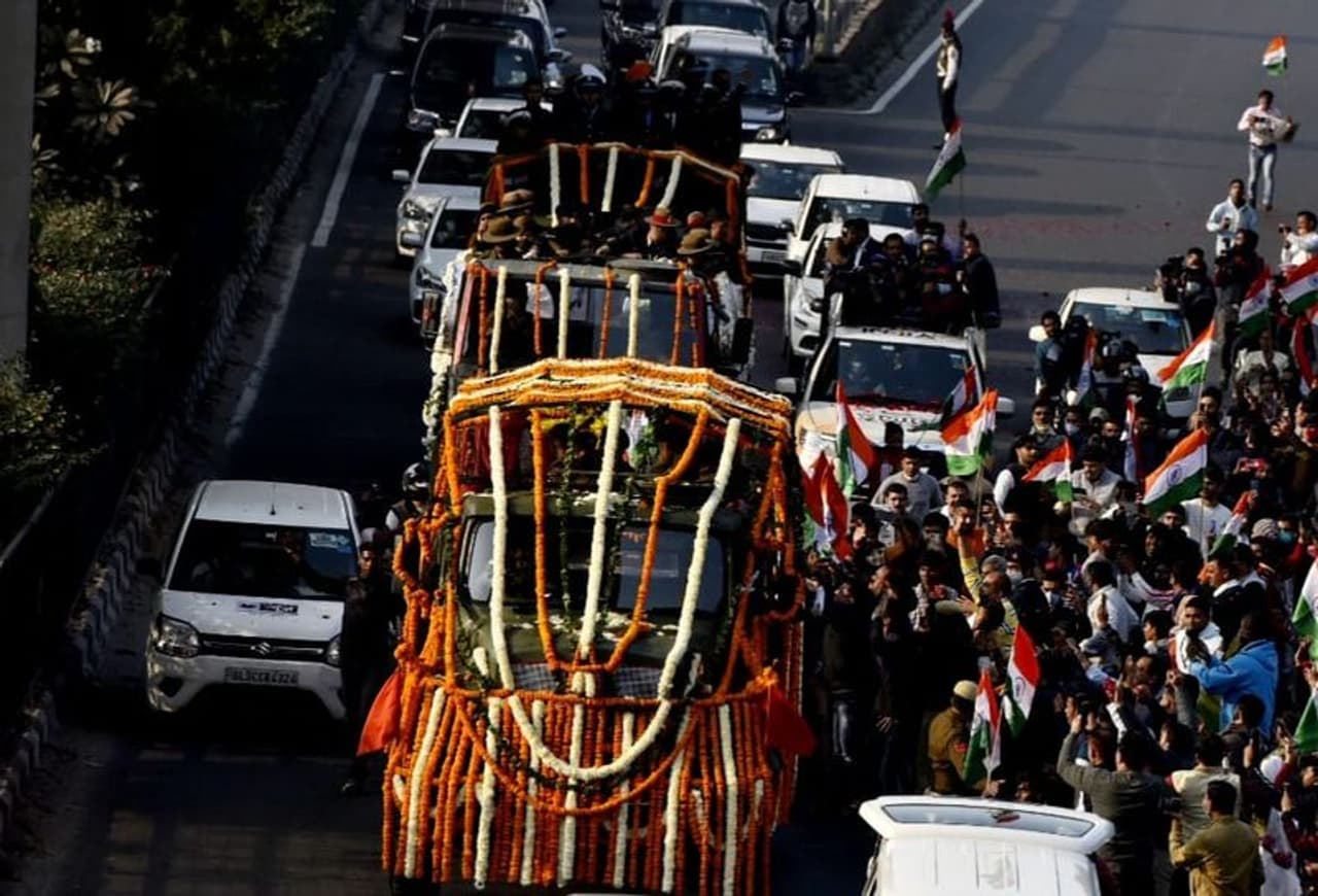 குன்னூர் அருகே நடந்த ராணுவ ஹெலிகாப்டர் விபத்தில் முப்படைகளின் தலைமை தளபதி, அவரது மனைவி உட்பட 13 பேர் உயிரிழந்தனர். இறந்தவர்களின் உடல்களுக்கு இறுதி மரியாதை செய்யப்பட்டு கோவை சூலூர் விமான நிலையத்திலிருந்து விமானம் வழியாக டெல்லி கொண்டுசெல்லப்பட்டது. தற்போது தலைமை தளபதி பிபின் ராவத் மற்றும் அவரது மனைவி மதுலிகாவின் இறுதி ஊர்வலம் நடைபெற்றது. தேசியக்கொடி ஏந்தி ஏராளமானோர் ஊர்வலத்தில் பங்கேற்றனர். ஊர்வலத்தில் வழிநெடுகிலும் மக்கள் மலர்தூவி அஞ்சலி செலுத்தினர். டெல்லி கன்டோன்மென்ட் மயானத்தில் இருவரின் உடல்களும் முழு ராணுவ மரியாதையுடன் சற்றுநேரத்தில் தகனம் செய்யப்படவுள்ளது. இந்நிலையில் அவர்களது உடலுக்கு பல்வேறு தலைவர்கள் இறுதி அஞ்சலி செலுத்தி வருகின்றனர்.