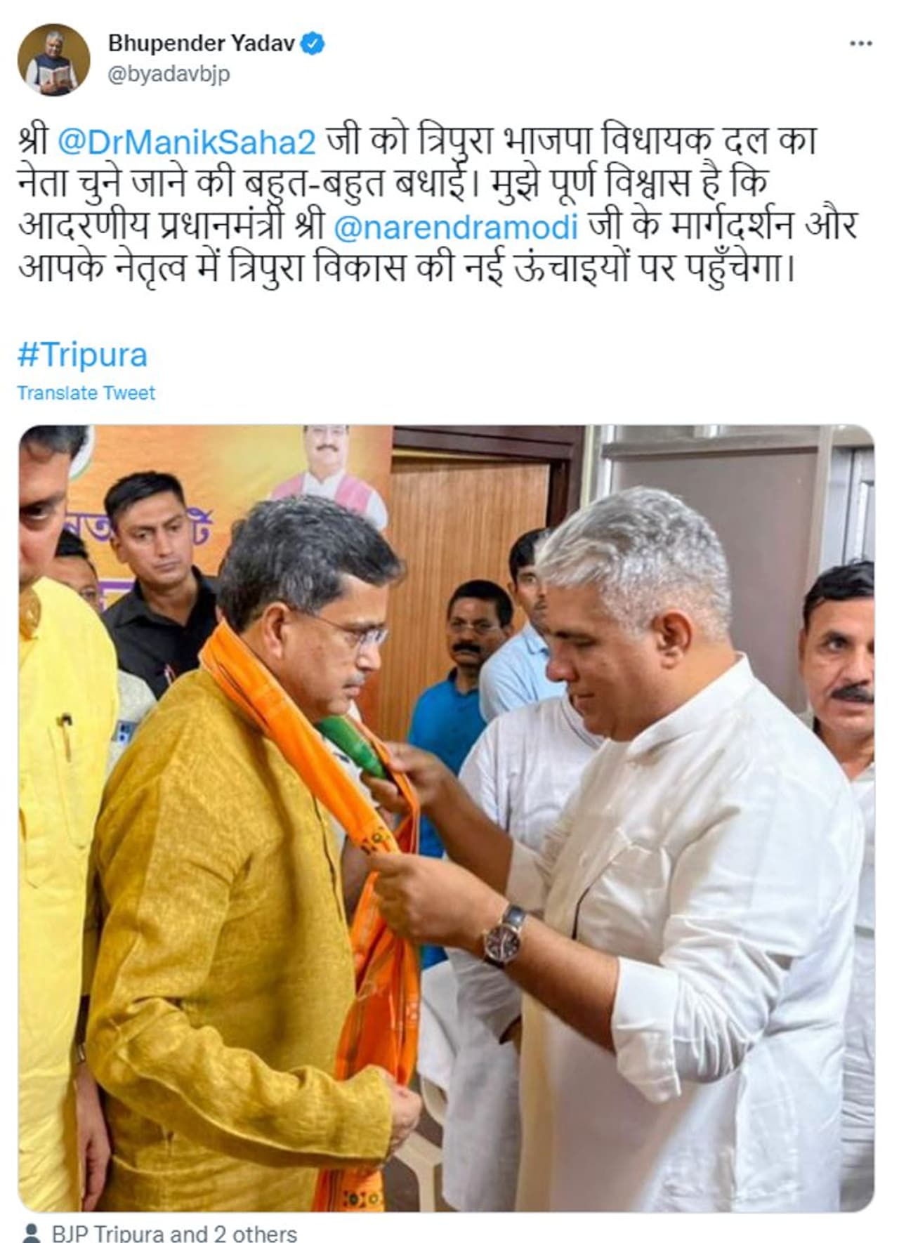 இந்நிலையில் பாஜக எம்.எல்.ஏக்கள் கூட்டத்தில் புதிய முதல்வராக அம்மாநில பாஜக தலைவர் மாணிக் சாஹா தேர்ந்தெடுக்கப்பட்டுள்ளது. தொடர்ந்து, பிப்லாப் தேப் புதிய முதலமைச்சராக தேர்ந்தெடுக்க சாஹாக்கு தனது டிவிட்டர் பக்கத்தில் வாழ்த்து தெரிவித்துள்ளார்.