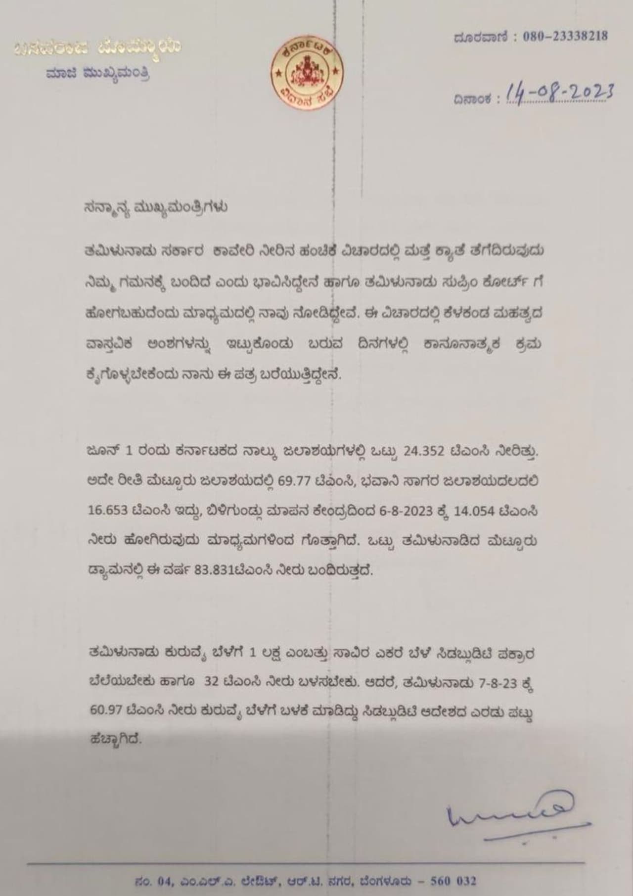 இந்த நிலையில், கர்நாடக முதல்வர் சித்தராமையாவுக்கு, முன்னாள் முதல்வர் பசவராஜ் பொம்மை எழுதியுள்ள கடிதத்தில், “காவிரி நதிநீர் பங்கீடு விவகாரத்தில் தமிழக அரசு மீண்டும் ஒரு நிலைப்பாட்டை எடுத்திருப்பதையும், தமிழகம் உச்சநீதிமன்றம் செல்லக்கூடும் என்பதை ஊடகங்களில் பார்த்ததையும் கவனித்திருப்பீர்கள் என்று நினைக்கிறேன். பின்வரும் முக்கியமான உண்மைகளைக் கருத்திற் கொண்டு எதிர்வரும் நாட்களில் சட்ட நடவடிக்கை எடுப்பதற்காக இந்தக் கடிதத்தை எழுதுகின்றேன்.