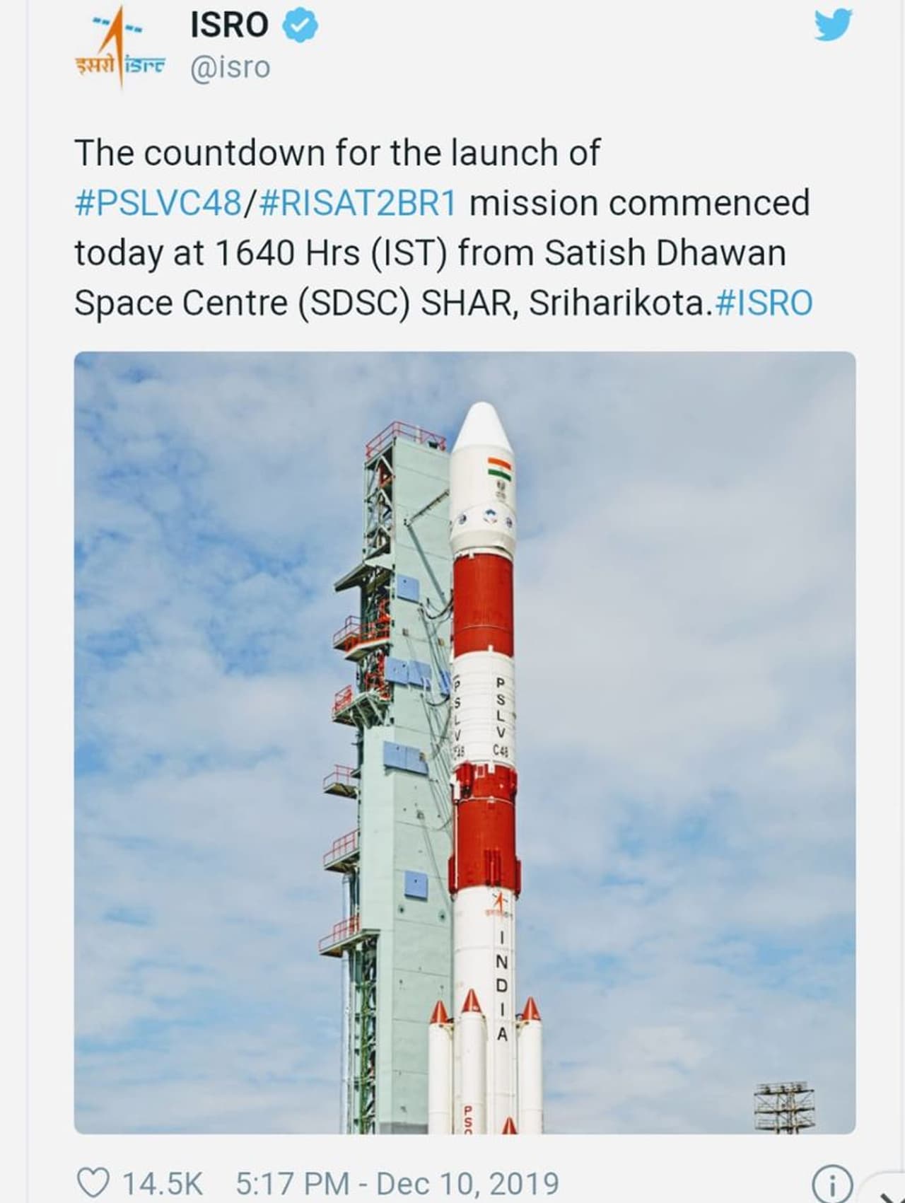 பூமியை கண்காணிக்கவும் ராணுவ பாதுகாப்புக்கு உதவும் வகையிலும் ரி சாட்- 2 பி ஆர் -1 செயற்கைக்கோளை தாங்கியபடி பிஎஸ்எல்வி 48 ராக்கெட் இன்று விண்ணில் செலுத்தப்பட உள்ளது . ஆந்திர மாநிலம் ஸ்ரீஹரிகோட்டாவில் உள்ள சதீஷ்தவான் விண்வெளி ஏவுதளத்தில் இருந்து பிற்பகல் 3. 25 மணிக்கு செயற்கைக்கோள்கள் விண்ணில் ஏவப்பட உள்ளது . சுமார் 628 கிலோ எடை கொண்ட இந்த செயற்கைக்கோள்களுடன் அமெரிக்காவில் 6 செயற்கைக்கோள்கள் , இஸ்ரேல் , ஜப்பான் , இத்தாலி , ஆகிய நாடுகளின் தலா ஒரு செயற்கைகோளும் வணிக ரீதியாக இந்த ராக்கெட் மூலம் விண்ணில் செலுத்தப்பட உள்ளன.