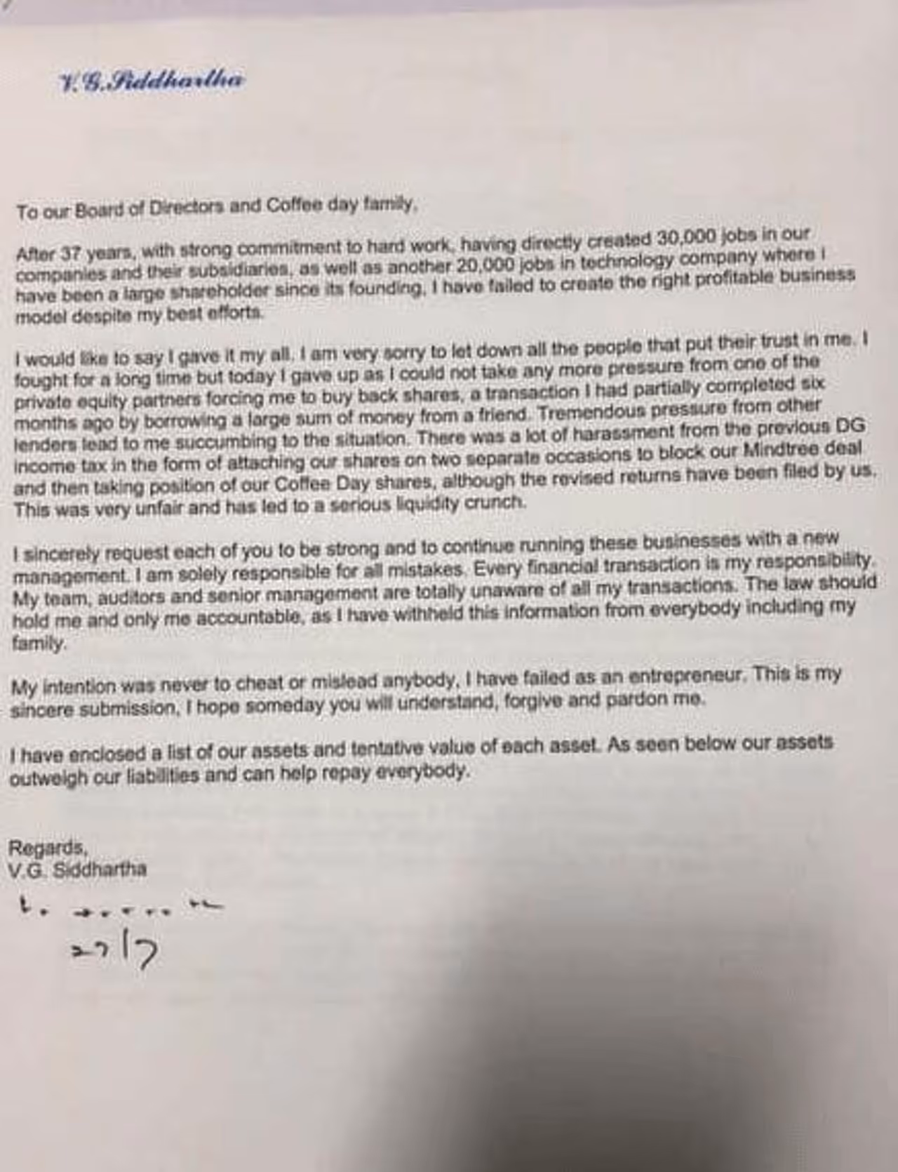 மேலும், சித்தார்த் எழுதியுள்ள அந்த கடிதத்தில், “37 வருடங்களுக்குப் பிறகு 30,000 நேரடி வேலை வாய்ப்புகளை உருவாக்கி, சிறந்த முறையில் இருந்தபோதிலும், என்னால் சரியான லாபகரமான தொழிலாக எடுத்துச்செல்ல முடியவில்லை. என் மீது நம்பிக்கை வைத்திருந்த அனைவரையும் கைவிட்டதற்காக நான் மிகவும் வருந்துகிறேன். நான் நீண்ட காலமாக போராடினேன், ஆனால் இன்று என்னால் எந்த அழுத்தத்தையும் எடுத்துச்செல்ல முடியாததால் கைவிடுகிறேன்.