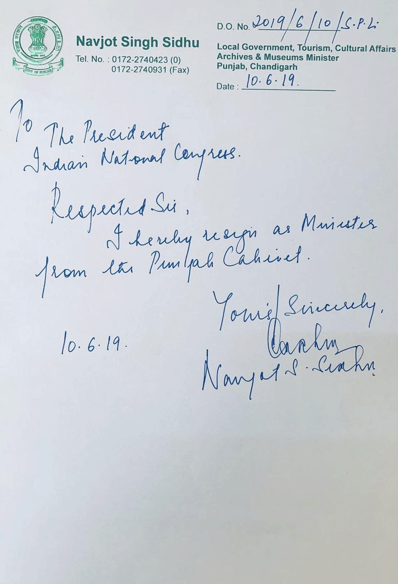 இந்நிலையில் பஞ்சாப் முதல்வர் முதல்வர் அமரீந்தர் சிங்குடன் தொடர்ந்து பிரச்சனை இருந்து வந்த நிலையில் அமைச்சர் பதவியை சித்து ராஜினாமா செய்துள்ளார். ராஜினாமா செய்தது குறித்து ஜூன் 10-ம் ராகுல்காந்திக்கு அனுப்பிய கடிதத்தை சித்து டுவிட்டரில் வெளியிட்டுள்ளார்.