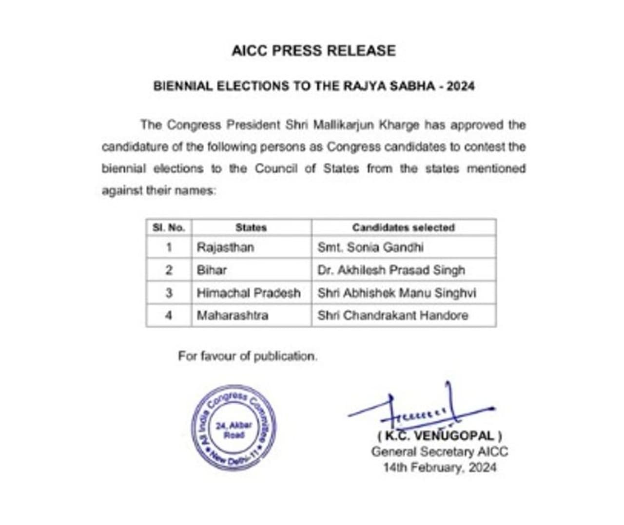 இந்த நிலையில் மாநிலங்களவை தேர்தலுக்கான காங்கிரஸ் கட்சியின் அதிகாரப்பூர்வ வேட்பாளர் பட்டியல் வெளியாகி உள்ளது. அதன்படி ராஜஸ்தானிலிருந்து மாநிலங்களவைக்கு சோனியா காந்தி தேர்வு செய்யப்படுகிறார். இவர் தற்போது உத்தர பிரதேசத்தின் ரே பரேலி மக்களவை தொகுதி எம்.பியாக உள்ளார்.