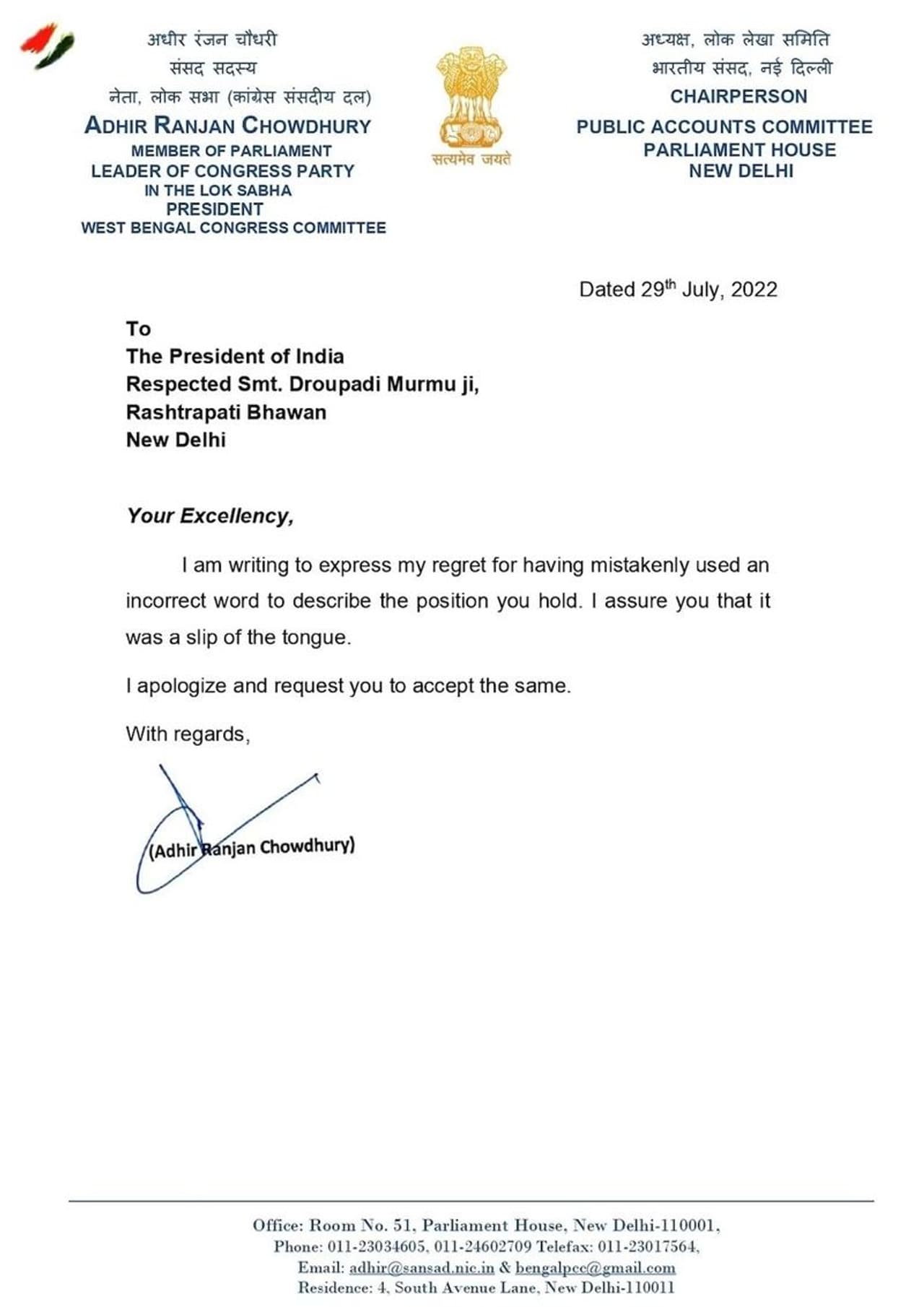 குடியரசுத்தலைவர் திரௌபதி முர்ழு குறித்து தாம் தெரிவித்த கருத்துக்கு காங்கிரஸ் எம்பி ஆதீர் ரஞ்சன் சௌத்ரி பகிரங்க மன்னிப்பு கோரியுள்ளார். நா தவறி அப்படி பேசி விட்டதாகவும் மன்னிப்பு கடிதத்தில் வருத்தம் தெரிவித்துள்ளார்.