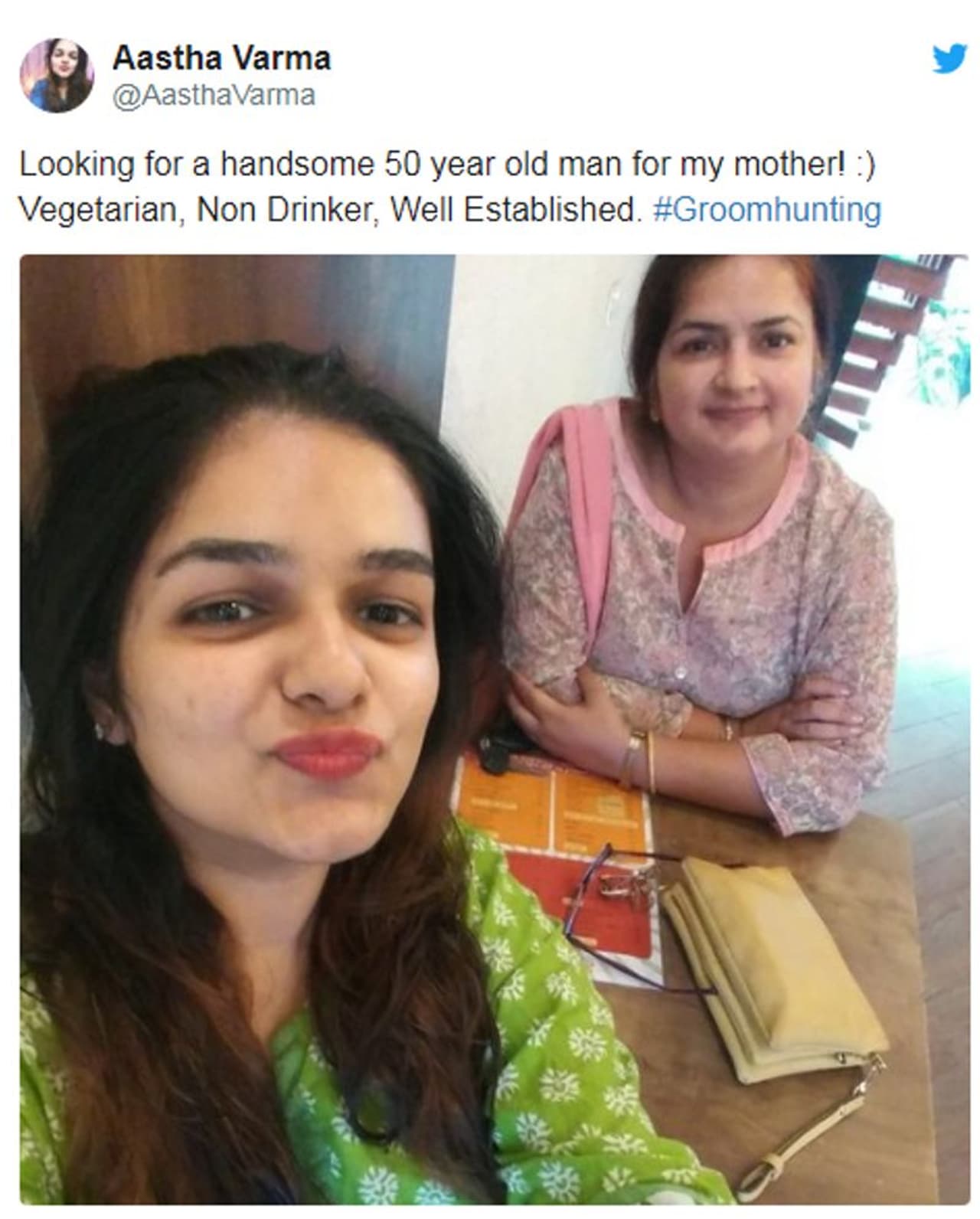 இந்தியாவை சேர்ந்த சட்டக்கல்லூரி மாணவிஆஸ்தா வர்மா. இவர் தன்னுடைய ட்விட்டர் பக்கத்தில், கடந்த வியாழக்கிழமை தன் தாயுடன் எடுத்த செல்ஃபியை பதிவிட்டார். அந்த பதிவில் தனது தாயை திருமணம் செய்துகொள்ள அழகான 50 வயதான நபர் தேவை என குறிப்பிட்டுள்ளார். அதுமட்டுமல்லாமல் மணமகன் சைவ உணவு உண்பவராகவும், மது பழக்கம் இல்லாதவராகவும் இருக்க வேண்டும் என, அவர் பதிவில் குறிப்பிட்டுள்ளார்.