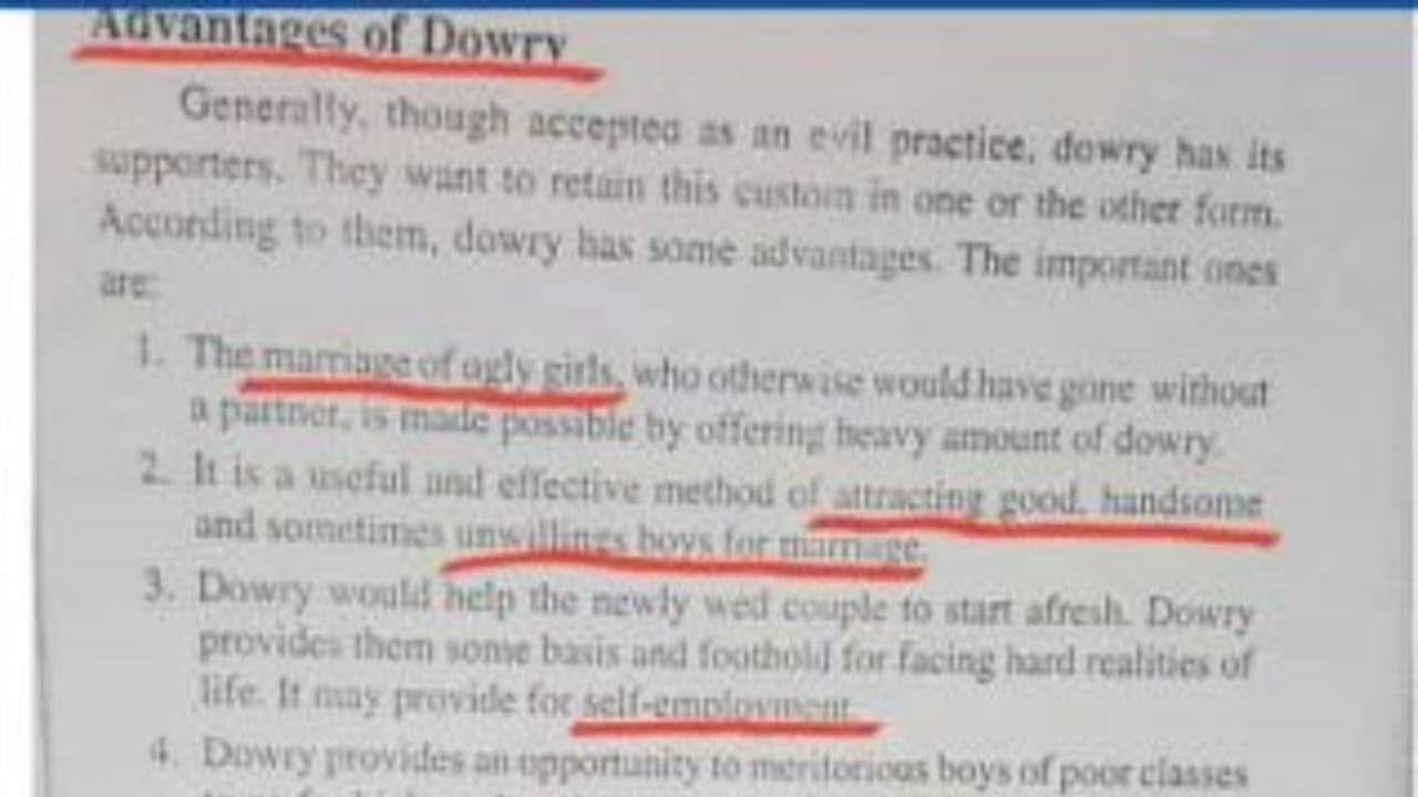 குடும்ப நடைமுறையில், ஒரு பெண்ணின் கௌரவத்தை வரதட்சணையே அக்குடும்பத்துக்குள் உயர்த்துகிறது. ஏழைக் குடும்பத்தைச் சேர்ந்த ஓர் ஆண், வரதட்சணை மூலம் கிடைக்கும் பணத்தைக் கொண்டு மேல் படிப்பைத் தொடர முடியும். சொத்தில் ஒரு பகுதியைக் கொடுப்பதை விட, வரதட்சணையாக சிறிதளவு பணம் கொடுப்பதே சரி என்றெல்லாம் அந்தப் பாடப் புத்தகத்தில் கூறப்பட்டிருந்தது.