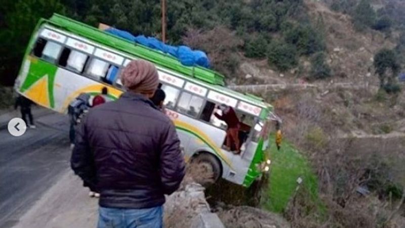 ஜம்மு காஷ்மீரின் கிஸ்த்வார் மாவட்டத்தில் இருந்து ஜம்மு நோக்கி பேருந்து ஒன்று சென்று கொண்டிருந்தது. இதில் சுமார் 30-க்கும் மேற்பட்ட பயணிகள் பயணம் செய்தனர். அப்போது சாலை முழுவதும் படர்ந்திருந்த பனியின் காரணமாக டயர்கள் வழுக்கி சென்றன. இதனால் மலை உச்சியில் சாலையோரத்தில் உள்ள கைப்பிடி சுவர்களுக்கு இடையே சிக்கியபடி தொங்கிய நிலையில் இருந்தது.