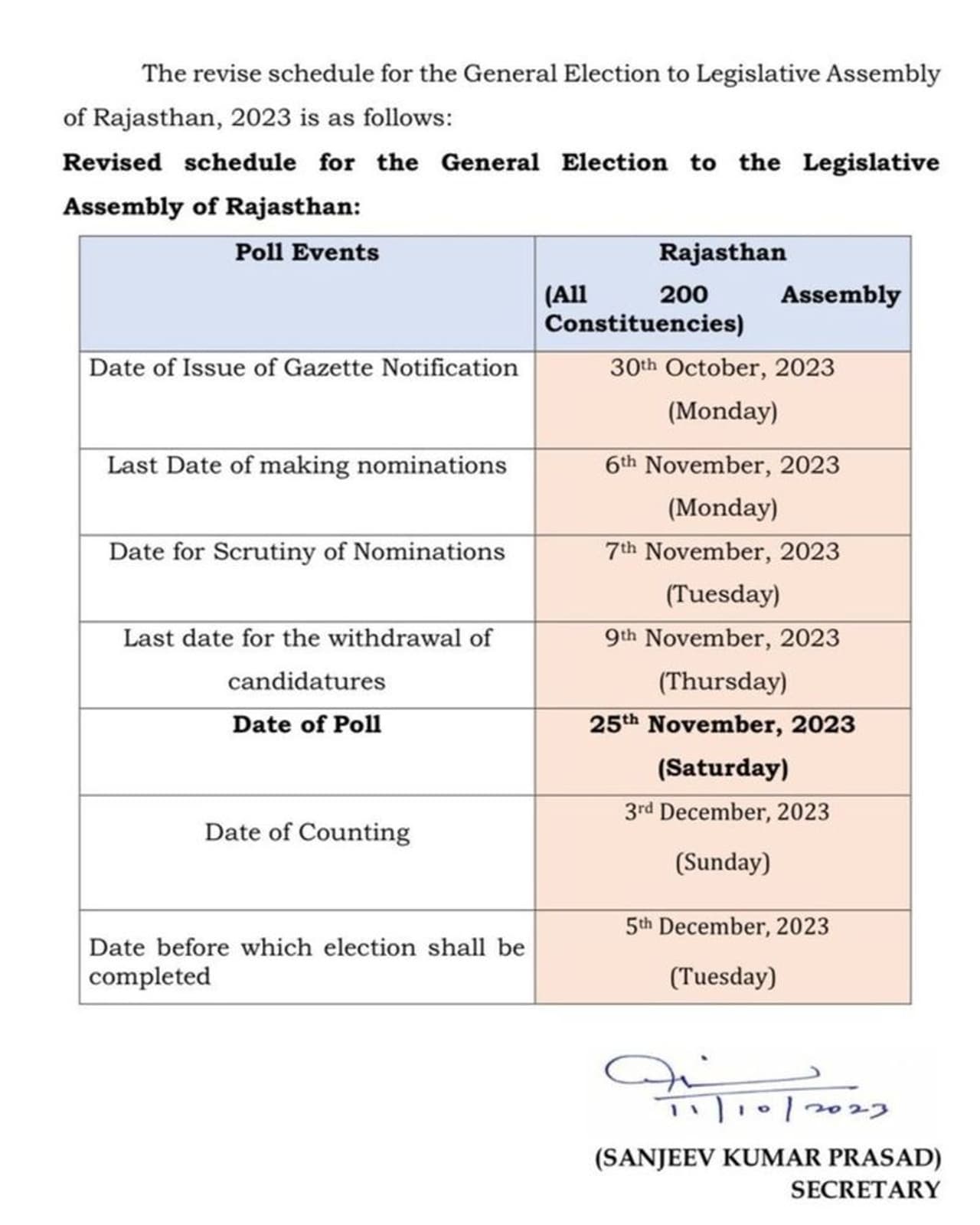 ராஜஸ்தான் சட்டசபை தேர்தல் தேதி தற்போது மாற்றம் செய்யப்பட்டுள்ளது. எனவே இனி இந்த நாட்களில் வாக்குப்பதிவு நடைபெறும் என்று கூறப்பட்டுள்ளது.