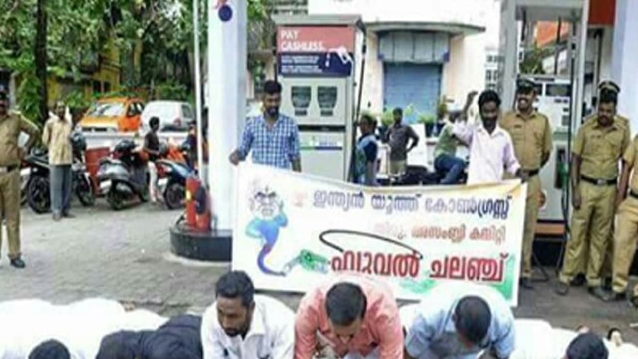 பிரதமர் மோடியின் பிட்னெஸ் சேலஞ்சுக்கு எதிர்வினையாக பெட்ரோல் பங்க்கில் கேரள இளைஞர் காங்கிரசார் உடற்பயிற்சி செய்யும் நூதன போராட்டம் நடத்தினர்.