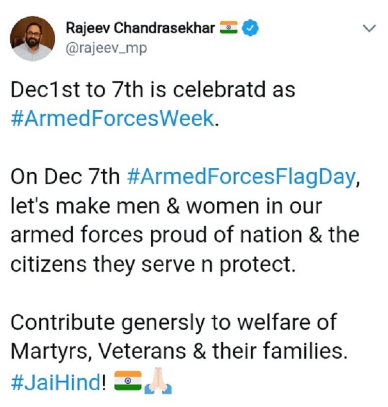 டிசம்பர் 7 ஆம் தேதி நாடு முழுவதும் ராணுவ கொடி நாள் கொண்டாடப்படவுள்ள நிலையில், நாட்டுக்காக தங்களையே அர்ப்பணித்து நாட்டுக்காகவும், சாட்டு மக்களுக்காகவும் போராடி வரும் ராணுவ வீர்களை போற்றுவோம் என்றும், கொடி நாளுக்காக அவர்களுக்கு நாம் தாராளமாக உதவுவோம் என்றும் பாஜக மாநிலங்களவை உறுப்பினர் ராஜீவ் சந்திரசேகர் கேட்டுக் கொண்டுள்ளார்.