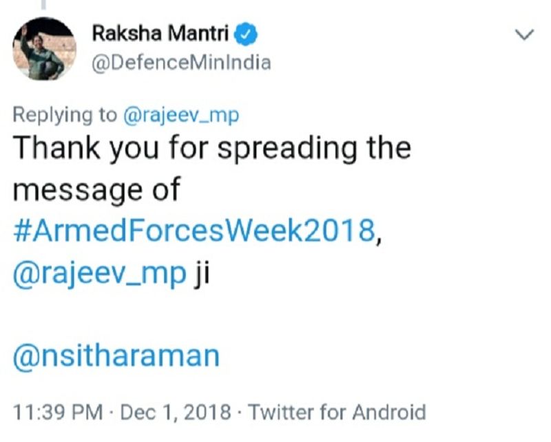 இவரது டுவீட்டைப் பாராட்டியுள்ள மத்திய பாதுகாப்புத் துறை அமைச்சர் நிர்மலா சீதாராமன், கொடி நாள் குறித்து டுவிட்டரில் பதிவிட்டதற்கு நன்றி தெரிவித்து, அதை அமைச்சர் ரீடுவிட் செய்துள்ளார்.