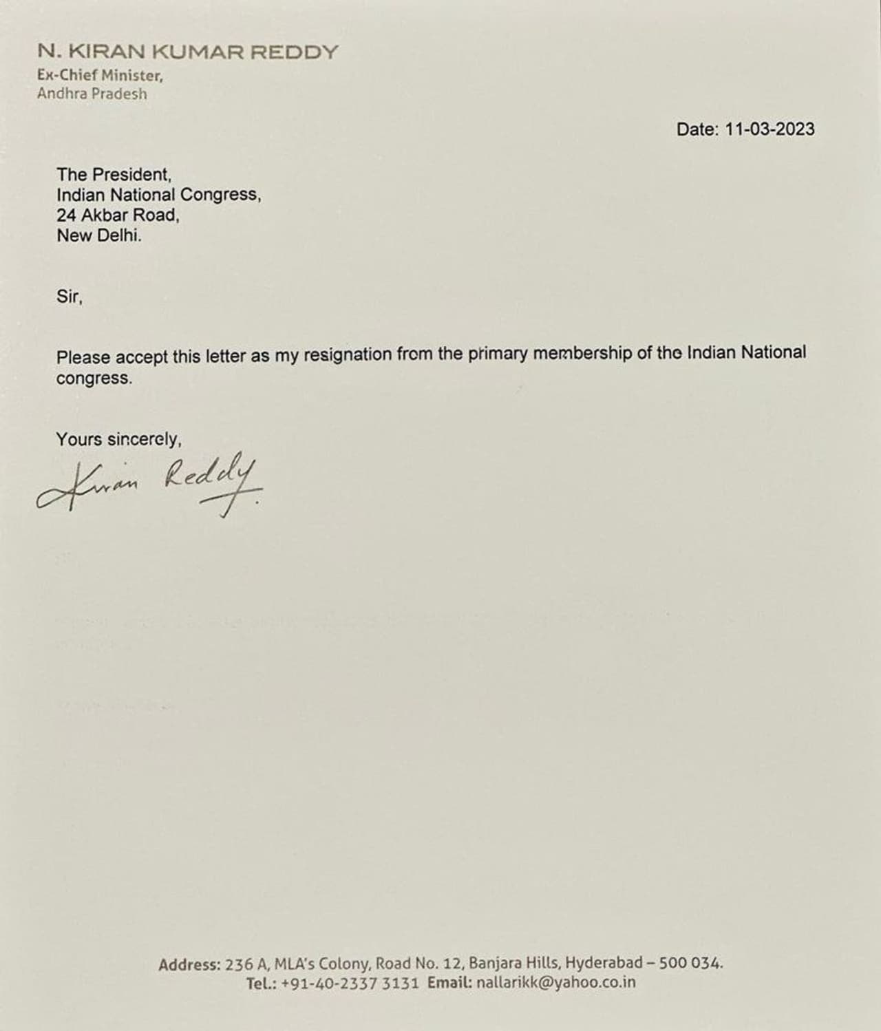 ஆந்திரப்பிரதேசத்தின் முன்னாள் முதல்வர் கிரண் குமார் ரெட்டி காங்கிரஸ் கட்சியின் தலைவர் பதவியை ராஜினாமா செய்தார்.