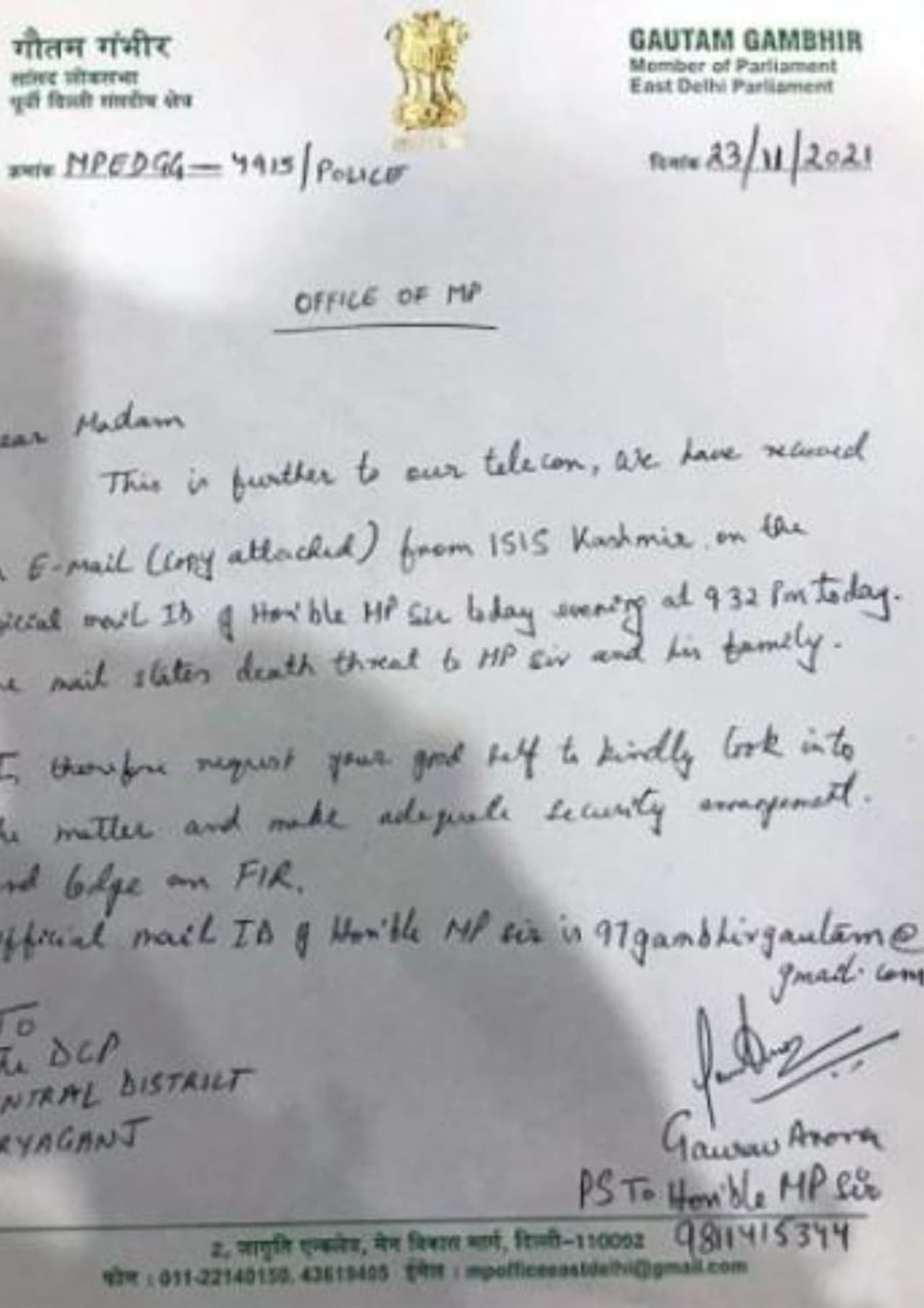 இந்திய அணியின் முன்னாள் கிரிக்கெட் வீரர் கவுதம் கம்பீருக்கு ஐஎஸ்ஐஎஸ் காஷ்மீர் என்ற தீவிரவாத அமைப்பில் இருந்து மிரட்டல் வந்துள்ளது.