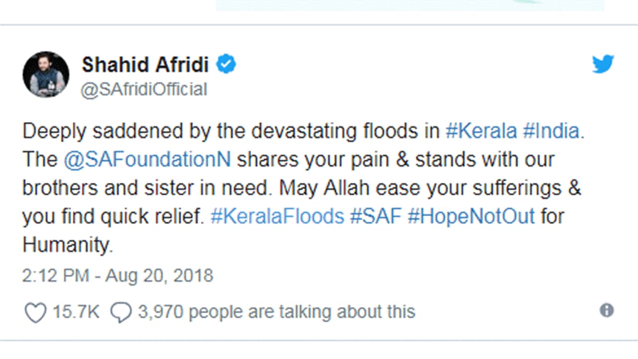 இந்நிலையில் பாகிஸ்தான் கிரிக்கெட் அணியின் முன்னாள் கேப்டன் அப்ரிடி ட்விட்டரில் ஆறுதல் தெரிவித்துள்ளார். அவர் வெளியிட்ட செய்தி குறிப்பில் கேரளாவில் ஏற்பட்டுள்ள வெள்ளம் தொடர்பாக அவர் வருத்தம் தெரிவித்துள்ளார். உங்களின் வேதனையை பகிர்ந்து கொள்கிறேன். மேலும் கேரள மக்களுக்கு எப்போதும் துணை நிற்போம் என்றார். விரைவில் அவர்கள் மீண்டு வர இறைவனை பிராத்திக்கிறேன் என தெரிவித்துள்ளார்.