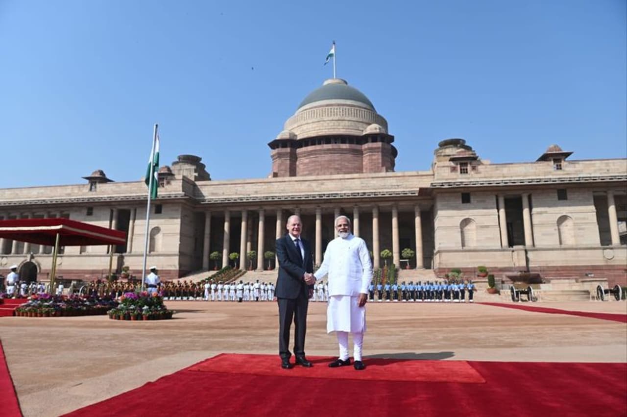 டெல்லி வந்த ஜெர்மன் அதிபர் ஓலப் ஸ்கோலஸ்க்கு குடியரசுத் தலைவர் மாளிகையில் சிவப்புக் கம்பள வரவேற்பு அளிக்கப்பட்டது. அணிவகுப்பு மரியாதையை ஏற்றுக்கொண்ட ஜெர்மன் அதிபர் ஸ்கோலஸை பிரதமர் மோடி வரவேறறார்.