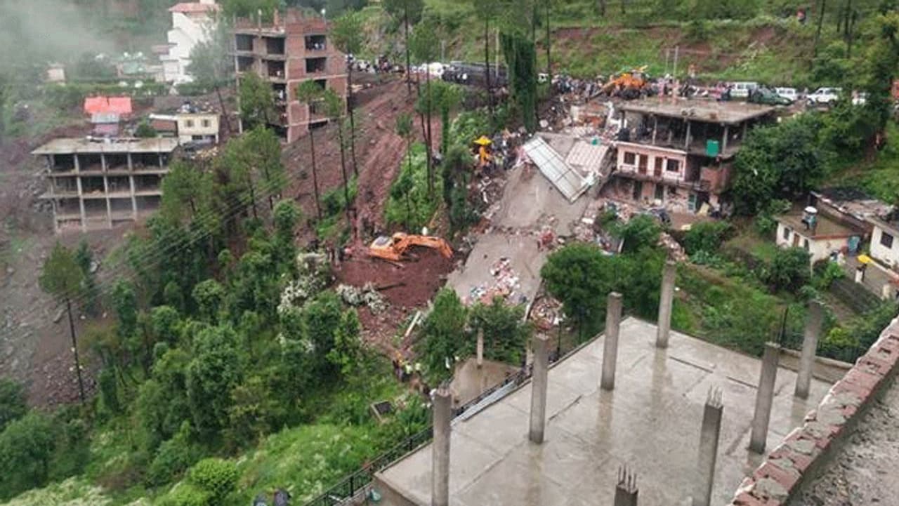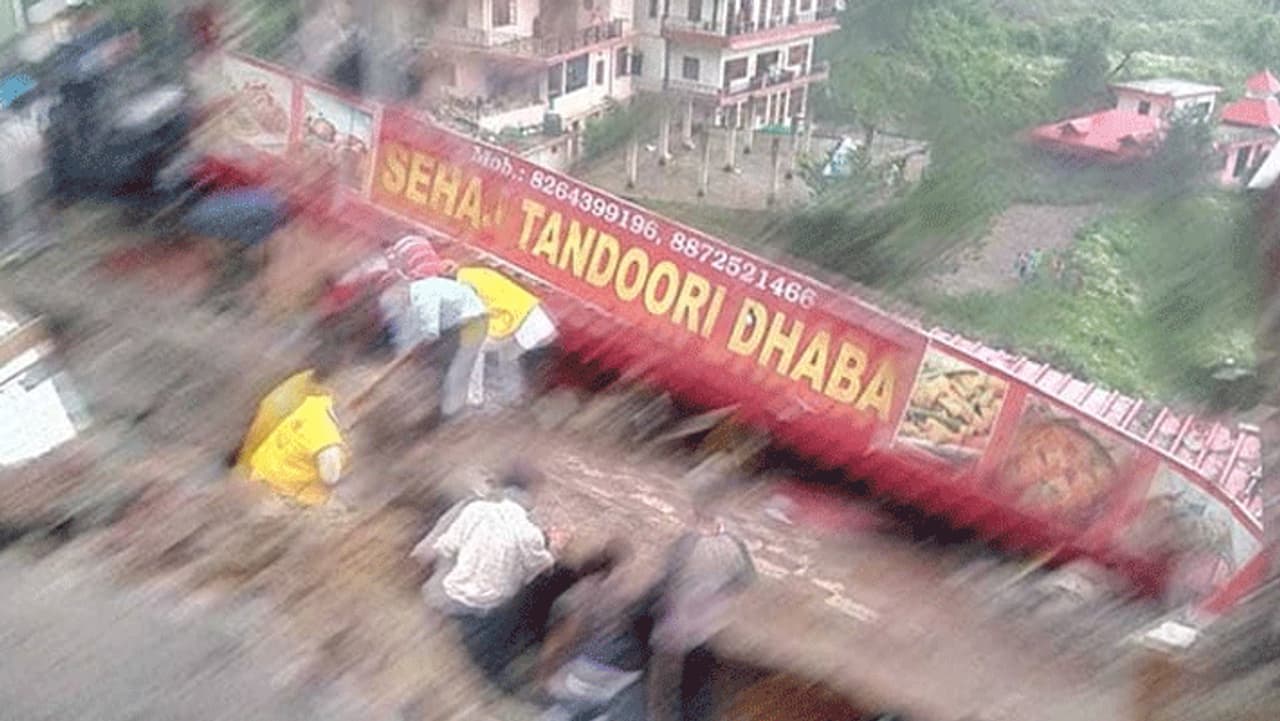இமாச்சலப் பிரதேசத்தில் கடந்த சில நாட்களாக கனமழை பெய்துவருகிறது. இதனால், பல்வேறு இடங்களில் வெள்ளப்பெருக்கு காரணமாக நிலச்சரிவு ஏற்பட்டது. மேலும், பொதுமக்களின் அன்றாட வாழ்க்கை முற்றிலுமாக பாதிக்கப்பட்டுள்ளது. கனமழையின் எதிரொலியாக அம்மாநிலத்தில் சோலன் பகுதியில் நேற்று மாலை அடுக்குமாடி தாபா உணவ கட்டிடம் திடீரென இடிந்து விழுந்தது.