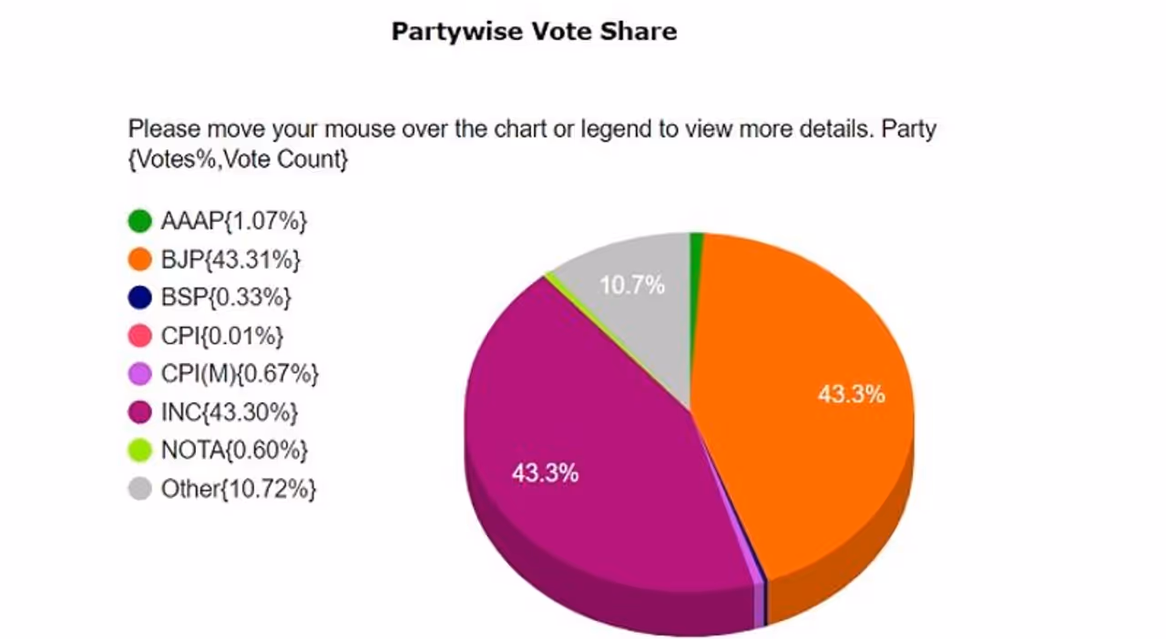 கடந்த 2017ம் ஆண்டில் நடந்த தேர்தலோடு ஒப்பிட்டால், பாஜக 48.80 சதவீத வாக்குகளைப் பெற்று, 44 இடங்களில் வென்றிருந்தது. ஆனால், இந்தத் தேர்தலில் 43 சதவீத வாக்குகளைப் பெற்று, 25 இடங்களில்தான் வென்றது