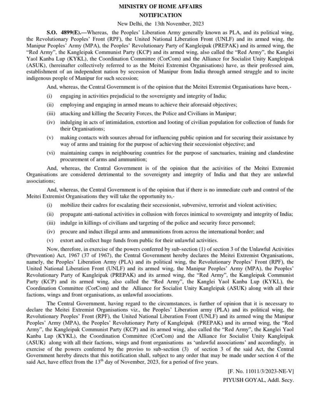 மத்திய உள்துறை அமைச்சகம் (MHA) திங்களன்று வெளியிட்ட ஒரு அறிவிப்பில் பல மெய்தீ ஆதர்வு அமைப்புகளை சட்டவிரோத செயல்பாடுகள் தடுப்புச் சட்டத்தின் (UAPA) கீழ் சட்டவிரோத அமைப்புகளாக அறிவித்துள்ளது. இந்த உத்தரவு திங்கள்கிழமை (நவம்பர் 13, 2023) முதலே நடைமுறைக்கு வருவதாகவும் ஐந்தாண்டு காலத்திற்கு இந்தத் தடை உத்தரவு அமலில் இருக்கும் என்றும் கூறப்பட்டுள்ளது.