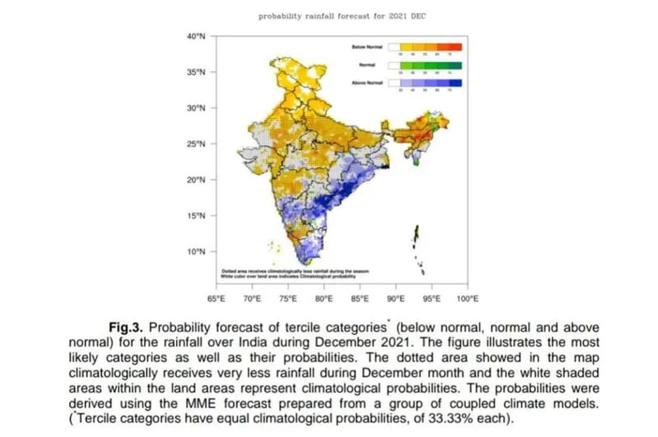 டிசம்பர் மாதத்தில் இயல்பை விட கூடுதலாக மழை பொழிவு இருக்கும் என இந்திய வானிலை ஆய்வு மையம் தெரிவித்துள்ளது. வடகிழக்கு பருவமழை தீவிரமடைந்ததை அடுத்து தமிழகத்தின் பெரும்பாலான பகுதிகளில் கனமழை பெய்து வருகிறது. இதன் காரணமாக அனைத்து நீர் நிலைகளும் நிரம்பி வெள்ளம் ஏற்பட்டுள்ளது. கடந்த சில நாட்களாக பெய்து வரும் தொடர் கனமழை காரணமாக பல மாவட்டங்களில் வெள்ளம் ஏற்பட்டு வீடுகளுக்குள் புகுந்ததால் மக்களின் இயல்பு வாழ்க்கை பாதிக்கப்பட்டுள்ளது. தமிழகம் மற்றும் புதுச்சேரியில், அக்டோபர் 1 ஆம் தேதி முதல் இன்று வரை 63 செ.மீ., மழை பதிவாகி உள்ளது. இது இயல்பான 35 செ.மீ., அளவை விட, 80 சதவீதம் அதிகம். இந்த பருவ மழை காலத்தில் இதுவரை மயிலாடுதுறை 102; கடலுார் 108; விழுப்புரம் 110; செங்கல்பட்டு 111; சென்னை 113; நாகை 114; காரைக்கால் 144; புதுச்சேரி 141 செ.மீ., என, எட்டு மாவட்டங்களில் 100 செ.மீ.,க்கு மேல் மழை பதிவாகியுள்ளது. இரு மாநிலங்களிலும் அதிகபட்சமாக காரைக்காலில் 144 செ.மீ; இரண்டாவதாக புதுச்சேரியில் 141 செ.மீ., மழை பெய்துள்ளது. மூன்றாவதாக நாகப்பட்டினத்தில் 114 செ.மீ., மழை பெய்துள்ளது. சென்னையில் இந்த பருவ காலத்தில், 113 செ.மீ., மழை பெய்துள்ளது.