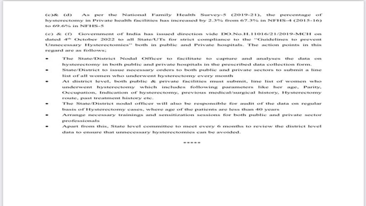 மேலும், தனியார் மற்றும் அரசு மருத்துவமனைகளில் தேவையில்லாத விதத்தில் கருப்பை நீக்க அறுவை சிகிச்சை செய்வதைத் தவிர்க்கும் பொருட்டு இந்திய ஒன்றிய அரசால் வெளியிடப்பட்டுள்ள வழிகாட்டு நெறிமுறைகளைக் கறாராகப் பின்பற்ற அறிவுறுத்தி இந்திய அரசு 2022 அக்டோபர் 4 இல் உத்தரவிட்டுள்ளதாகவும் அமைச்சர் அளித்த பதிலில் தெரிவிக்கப்பட்டுள்ளது.