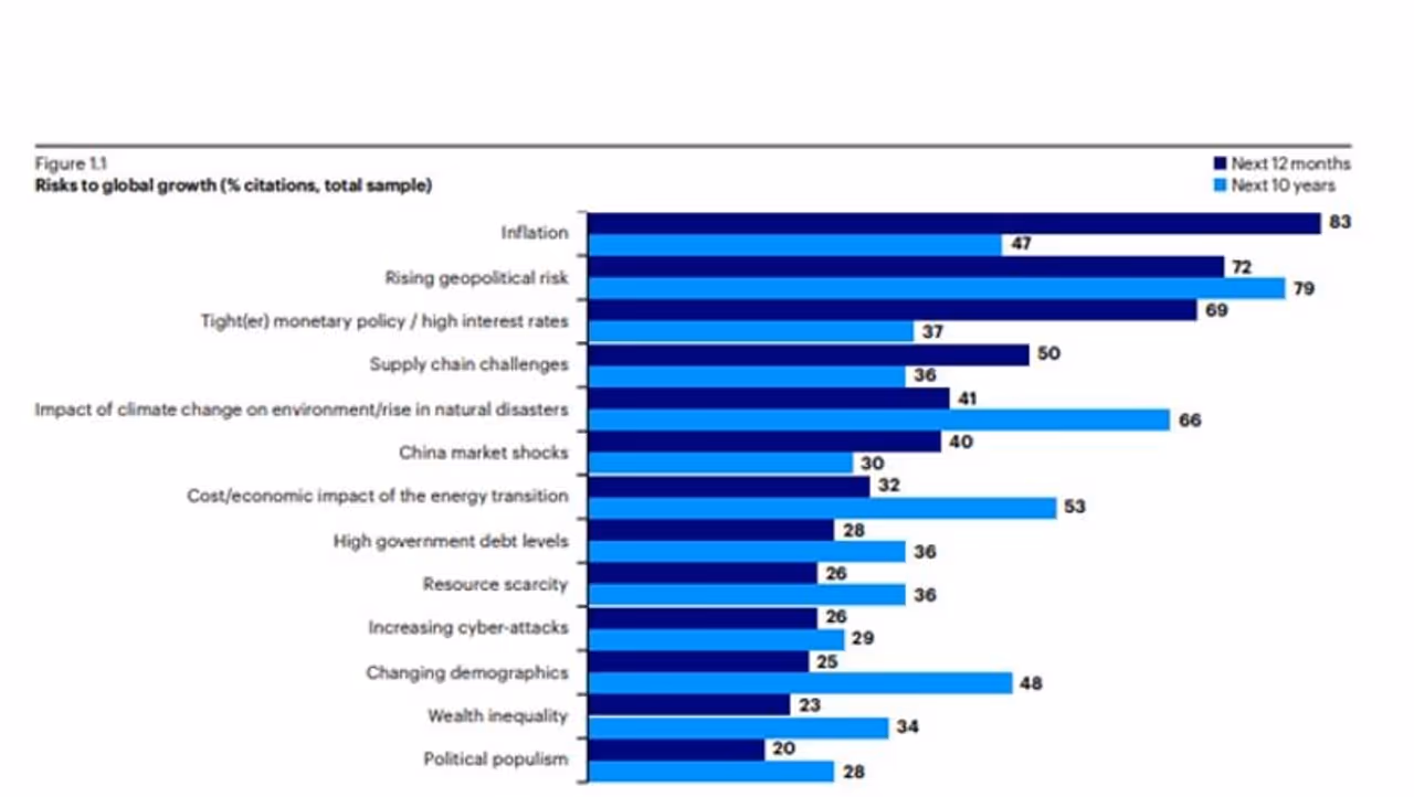 அறிக்கையின்படி, புவிசார் அரசியல் கவலைகள் முதலீட்டாளர்களின் மனதில் உள்ளது, 72% முதலீட்டாளர்கள் வரவிருக்கும் ஆண்டில் உலகளாவிய வளர்ச்சிக்கான ஆபத்து என்றும், 79% பேர் அடுத்த 10 ஆண்டுகளில் புவிசார் அரசியல் அபாயத்தை ஒரு கவலையாகக் குறிப்பிட்டுள்ளனர்.