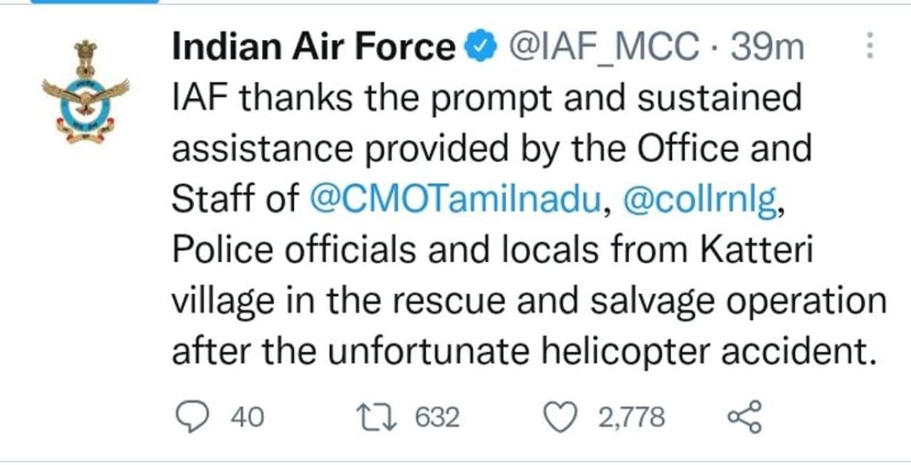 இந்நிலையில், இன்று இந்திய விமானப்படை தமிழக முதல்வருக்கு நன்றியை தெரிவித்து இருக்கிறது. இந்திய விமானப்படையின் ட்விட்டர் பக்கத்தில் வெளியிட்ட அந்த பதிவில், ‘துரதிர்ஷ்டவசமான ஹெலிகாப்டர் விபத்தின் மீட்பு பணிகளுக்கு உடனடியாக உதவிய தமிழ்நாடு முதலமைச்சர் மு.க.ஸ்டாலினுக்கு நன்றி. மீட்பு பணிக்கு உதவிய நீலகிரி ஆட்சியர், காவல்துறை அதிகாரிகள் மற்றும் கட்டேரி கிராம பொதுமக்கள் ஆகியோருக்கும் நன்றியை தெரிவித்துக்கொள்கிறோம் என்று கூறப்பட்டுள்ளது.