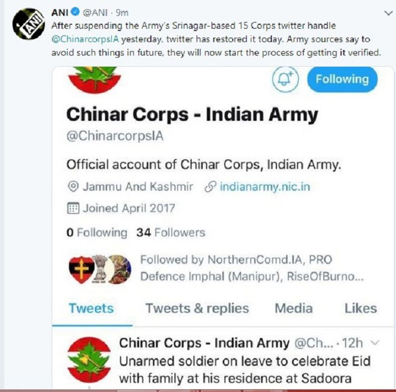 இந்நிலையில் நேற்று சினார் கார்ப்ஸ் இந்திய ராணுவத்தின் அதிகாப்பூர்வ பக்கம் திடீரென முடக்கப்பட்டது. இதற்கு கடும் கண்டணம் எழுந்த நிலையில் இன்று மீண்டும் டுவிட்டர் பக்கம் இயங்கத் தொடங்கியது. ஆனால் சினார் கார்ப்ஸ் இந்திய ராணுவத்தின் டுவிட்டர் பக்கம் ஏன் முடக்கப்பட்டது ? என்பதற்கான காரணத்தை டுவிட்டர் நிறுவனம் தெரிவிக்கவில்லை.