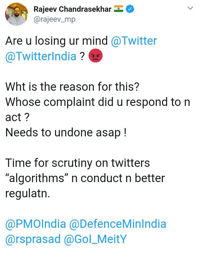 இந்திய ராணுவத்தின் டுவிட்டர் பக்கம் முடக்கப்பட்டதற்கு காரணம் யார் ? இது குறித்து யார் புகார் அளித்தனர்? டுவிட்டர் குறித்து ஆய்வு செய்து, சரியான முடிவெடுக்க வேண்டிய நேரம் வந்துவிட்டது என்றம் ராஜீவ் சந்திரசேகர் காட்டமாக தெரிவித்துள்ளார்