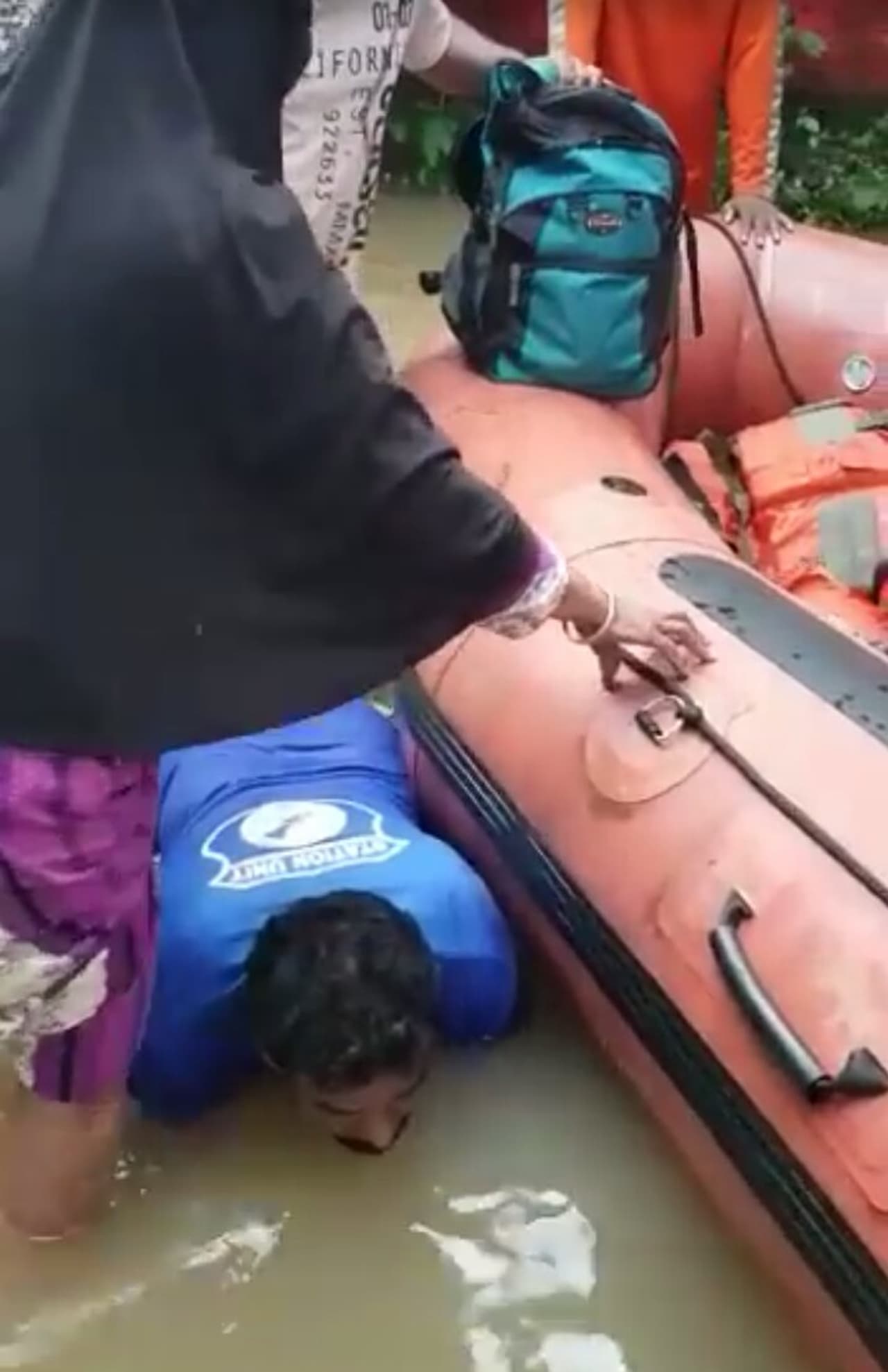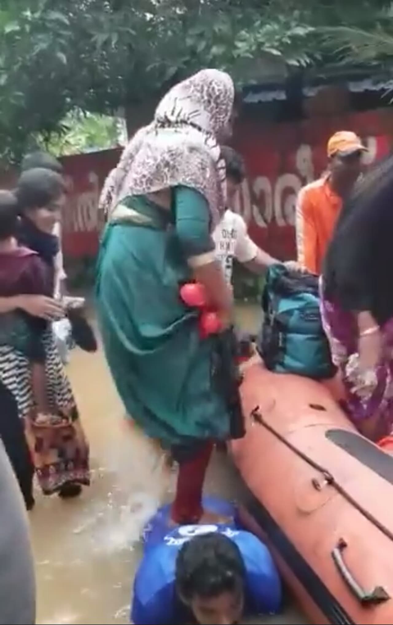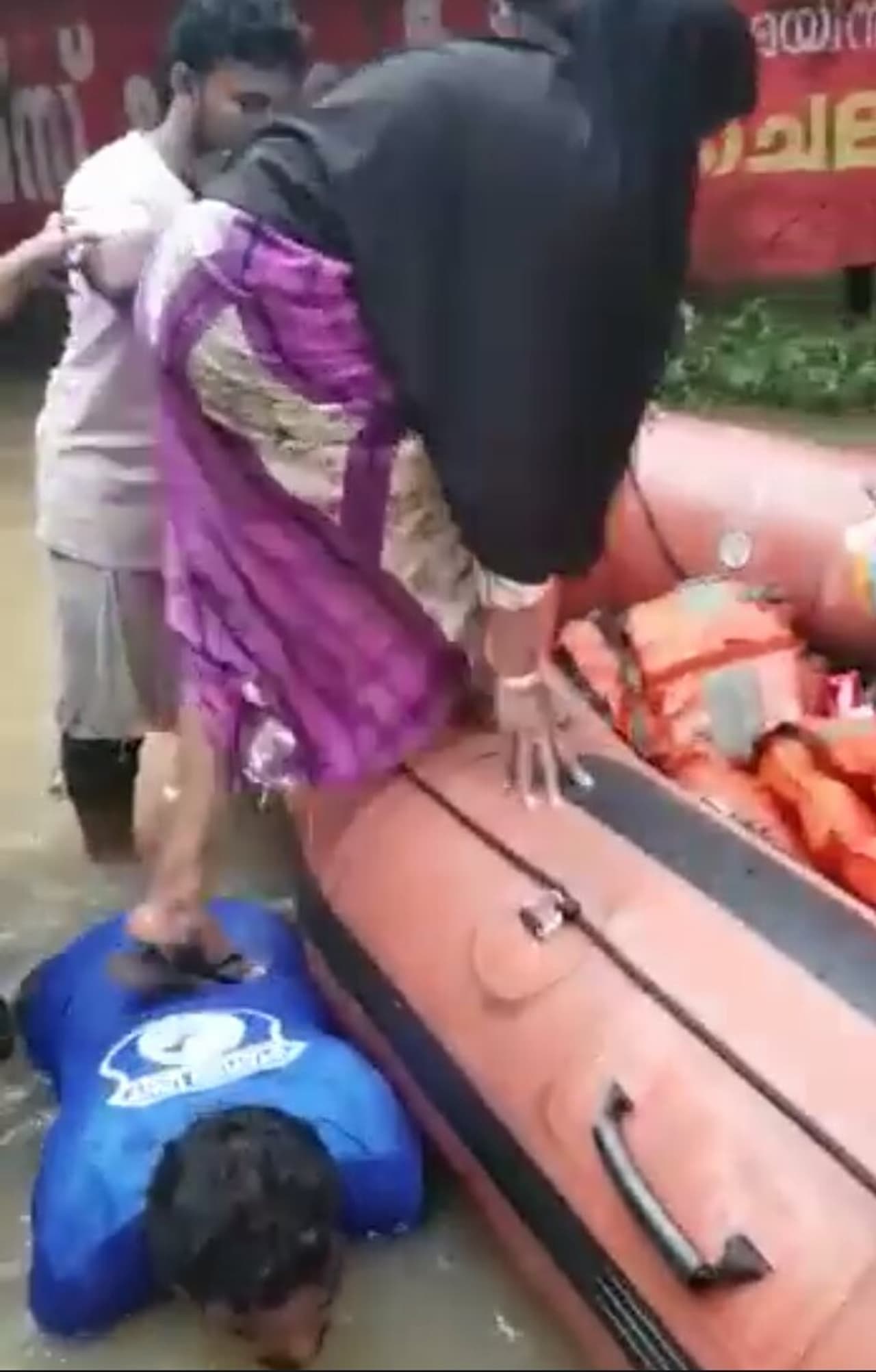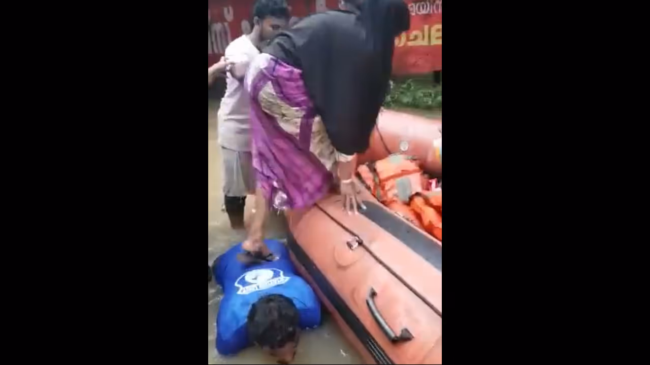 கேரள மாநிலம் பத்தனந்திட்டா பகுதியில் மழையில் மூழ்கியுள்ள வீடுகளில் இருந்து மீட்கப்பட்ட பெண்கள் படகில் ஏற முடியாமல் தவித்த போது இளைஞர் ஒருவர் நீரில் மூழ்கி மண்டியிட்டு அமர்ந்து அவரின் முதுகை படிக்கட்டு போல் வைத்துக் கொள்ள அங்கிருந்த அனைத்துப் பெண்களும், குழந்தைகளும் அதில் ஏறி படகிற்குள் அமர்ந்தனர். தன்னார்வ இளைஞர்களின் இந்த செயல் சமூக வலைதளங்களில் வைரலாகி நெகிழ்ச்சியை ஏற்படுத்தியுள்ளது.
