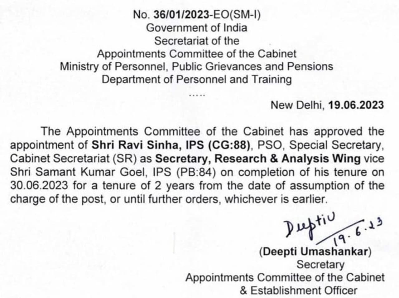 ஜூன் 30ஆம் தேதி தனது பதவிக்காலத்தை முடிக்கும் சமந்த் குமார் கோயலுக்குப் பதிலாக நியமிக்கப்பட்டுள்ள ரவி சின்ஹா இன்னும் இரண்டு ஆண்டுகளுக்கு ரா அமைப்பின் தலைவராக செயல்படுவார்.
