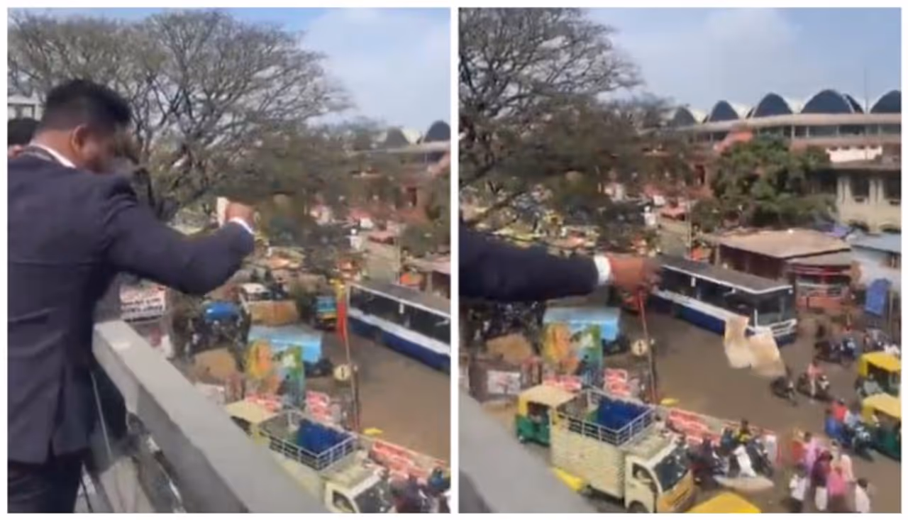 பரபரப்பான மார்க்கெட் பகுதியான அதில், அவ்வழியில் சென்ற இருந்த மக்கள் மீதும் பணத்தை வீசி மேம்பாலத்தில் போக்குவரத்தை நிறுத்தினார் அந்த நபர். நகரின் டவுன்ஹாலுக்கு அருகில் உள்ள கே.ஆர் மார்க்கெட்டில், மேம்பாலத்திற்கு கீழே கணிசமான கூட்டம் கூடியிருந்தது.