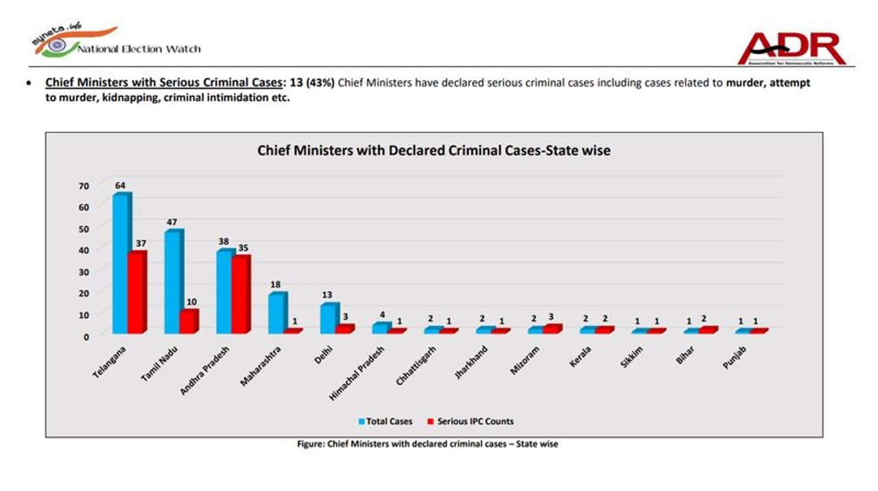பகுப்பாய்வு செய்யப்பட்ட 30 முதல்வர்களில், 29 பேர் (97 சதவீதம்) கோடீஸ்வரர்கள், ஒவ்வொரு முதல்வரின் சராசரி சொத்து மதிப்பு ரூ.33.96 கோடி. ஏடிஆர் அறிக்கையின்படி, 30 முதல்வர்களில் 13 பேர் (43 சதவீதம்) மீது கொலை, கொலை முயற்சி, கடத்தல் மற்றும் கிரிமினல் மிரட்டல் உள்ளிட்ட கடுமையான கிரிமினல் வழக்குகள் உள்ளன. ஐந்தாண்டுகளுக்கு மேல் சிறைத்தண்டனையுடன் கூடிய ஜாமீனில் வெளிவர முடியாத குற்றங்கள் குறித்த வழக்குகள் கடுமையான கிரிமினல் வழக்குகள் என்று கொள்ளப்பட்டிருப்பதாக அறிக்கையில் தெரிவிக்கப்பட்டுள்ளது. 17 முதல்வர்கள் (57 சதவீதம்) மீது எந்தவிதமான வழக்குகளும் இல்லை.
