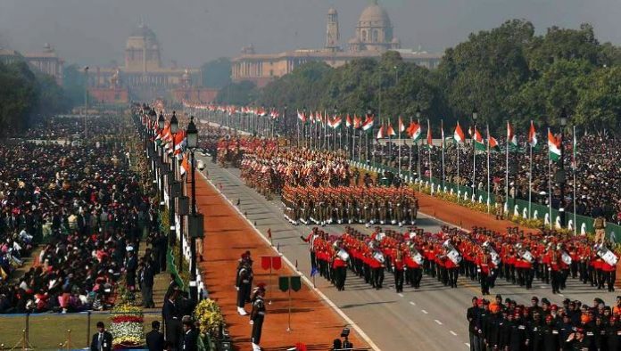 இதேபோல் தலைநகர் டெல்லியின் நடந்த குடியரசு தின விழாவில், ஜனாதிபதி பிரணாப் முகர்ஜி தேசிய கொடியேற்றினார். பின்ன, முப்படை அணிவகுப்பு மரியாதை நடந்தது. பல்வேறு மாநிலங்களின் பண்பாடு மற்றும் கலாசாரத்தை பறைசாற்றும் அலங்கார ஊர்திகள் அணிவகுப்பது வழக்கம்.