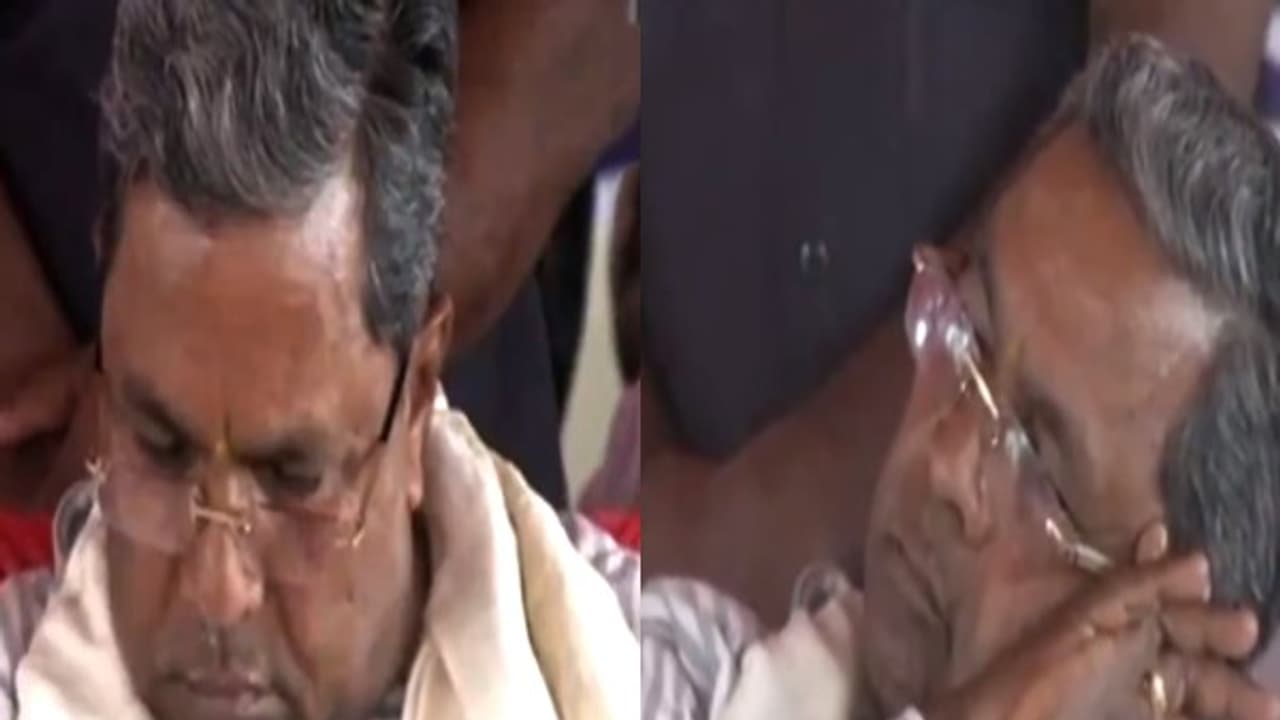 சிறிது நேரம் தூங்கிய அவரை, அருகில் அமர்ந்திருந்தவர் எழுப்பினார். விழித்து பார்த்த முதல்வர் சித்தராமையா, கையை வைத்து கன்னத்தை தாங்கியபடி மீண்டும் தூங்க ஆரம்பித்தார்.
