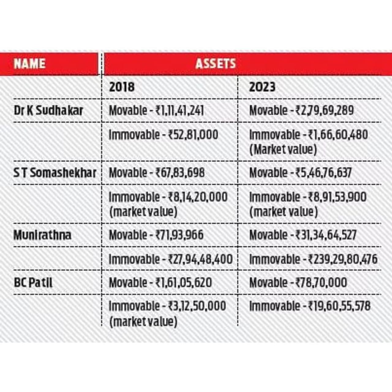 அதேபோல், ரூ.52,81,000 ஆக இருந்த அவரது அசையாச் சொத்து இப்போது ரூ.1,66,60,480 ஆக உள்ளது. சுதாகரின் மனைவிக்கு சொந்தமான அசையா சொத்துக்கள் 2018 இல் ரூ.1,17,63,871 ஆகவும், ஐந்தே ஆண்டுகளில் ரூ.16,10,04,961 ஆகவும் உயர்ந்துள்ளது. 2018-ல் ரூ.18,93,217 ஆக இருந்த மகேஷ் குமடஹள்ளியின் அசையும் சொத்து ரூ.1,33,32,819 ஆகவும், 2018-ல் ரூ.67.83 லட்சமாக இருந்த கூட்டுறவு அமைச்சர் எஸ்.டி.சோமசேகரின் அசையும் சொத்து 2023-ல் ரூ.5.46 கோடியாகவும் உயர்ந்துள்ளது.