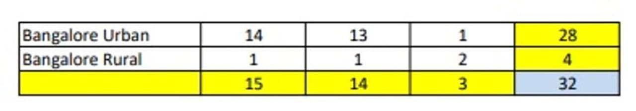 பெங்களூரில் மொத்தமுள்ள 32 இடங்களில் பாஜக 15 இடங்களை கைப்பற்றும் என தெரிவிக்கப்பட்டுள்ளது. மேலும் காங்கிரஸ் கட்சிக்கு 14 இடங்களும் ஜேடி(எஸ்) கட்சிக்கு 3 இடங்களும் கிடைக்கும் என கணிக்கப்பட்டுள்ளது.