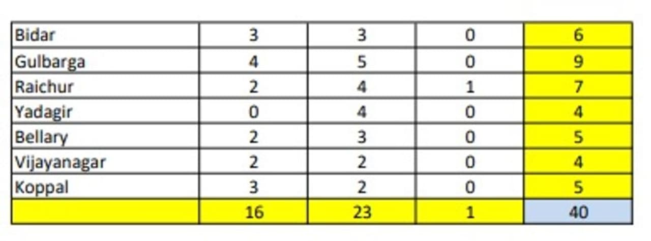 ஹைதராபாத் கர்நாடகாவில் மொத்தமுள்ள 40 இடங்களில் பாஜக 16 இடங்களை கைப்பற்றும் என கருத்துக்கணிப்பு கூறுகிறது. காங்கிரஸ் 23 இடங்களையும் ஜேடி(எஸ்) 1 இடத்தையும் கைப்பற்றும் என கணிக்கப்பட்டுள்ளது.