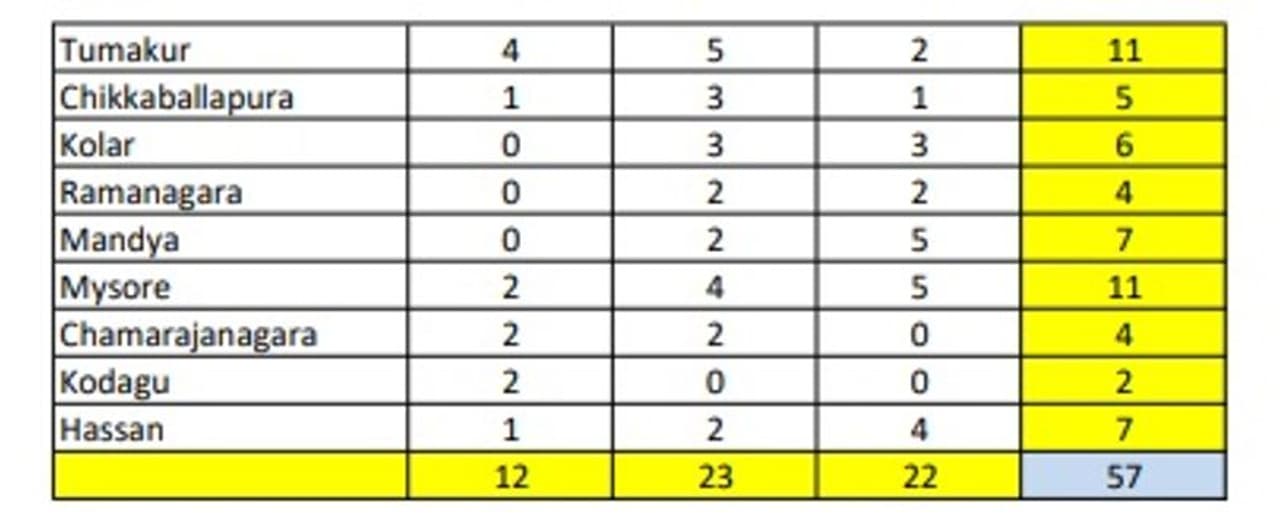பழைய மைசூரு பகுதிகளில் உள்ள மொத்தம் 57 இடங்களில் காங்கிரஸ் 23 இடங்களை பிடிக்கும் என கணிக்கப்பட்டுள்ளது. பாஜகவுக்கு 12 இடங்களும், காங்கிரஸுக்கு 23 இடங்களும் கிடைக்கும் என்று கருத்துக் கணிப்பு தெரிவிக்கிறது. ஜேடி(எஸ்) கட்சிக்கு 22 இடங்கள் கிடைக்கும் என கணிக்கப்பட்டுள்ளது.