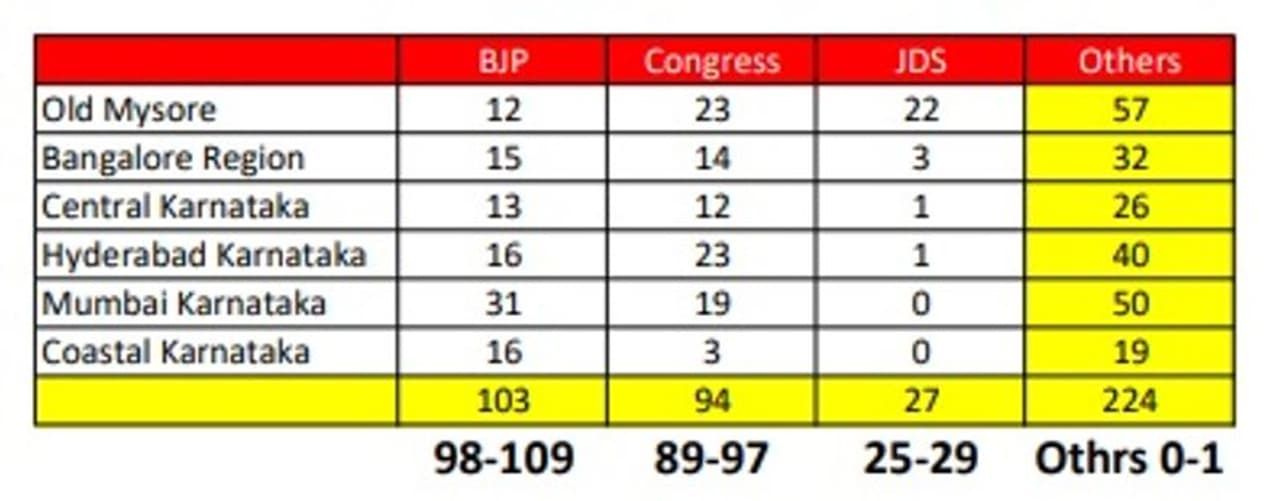 ஒட்டுமொத்த கர்நாடகாவில் காங்கிரஸ் 38-40% வாக்குளையும் பாஜக 37-39% வாக்குகளையும் ஜேடி(எஸ்) கட்சி 16-18% வாக்குகளையும் பெறும் என கருத்துக்கணிப்பில் தெரிவிக்கப்பட்டுள்ளது. இந்த கருத்துக்கணிப்புகள் பாஜக வேட்பாளர்களை அறிவிப்பதற்கு முன்பு எடுக்கப்பட்டது என்பதால் இதில் மாற்றங்கள் ஏற்படலாம்.