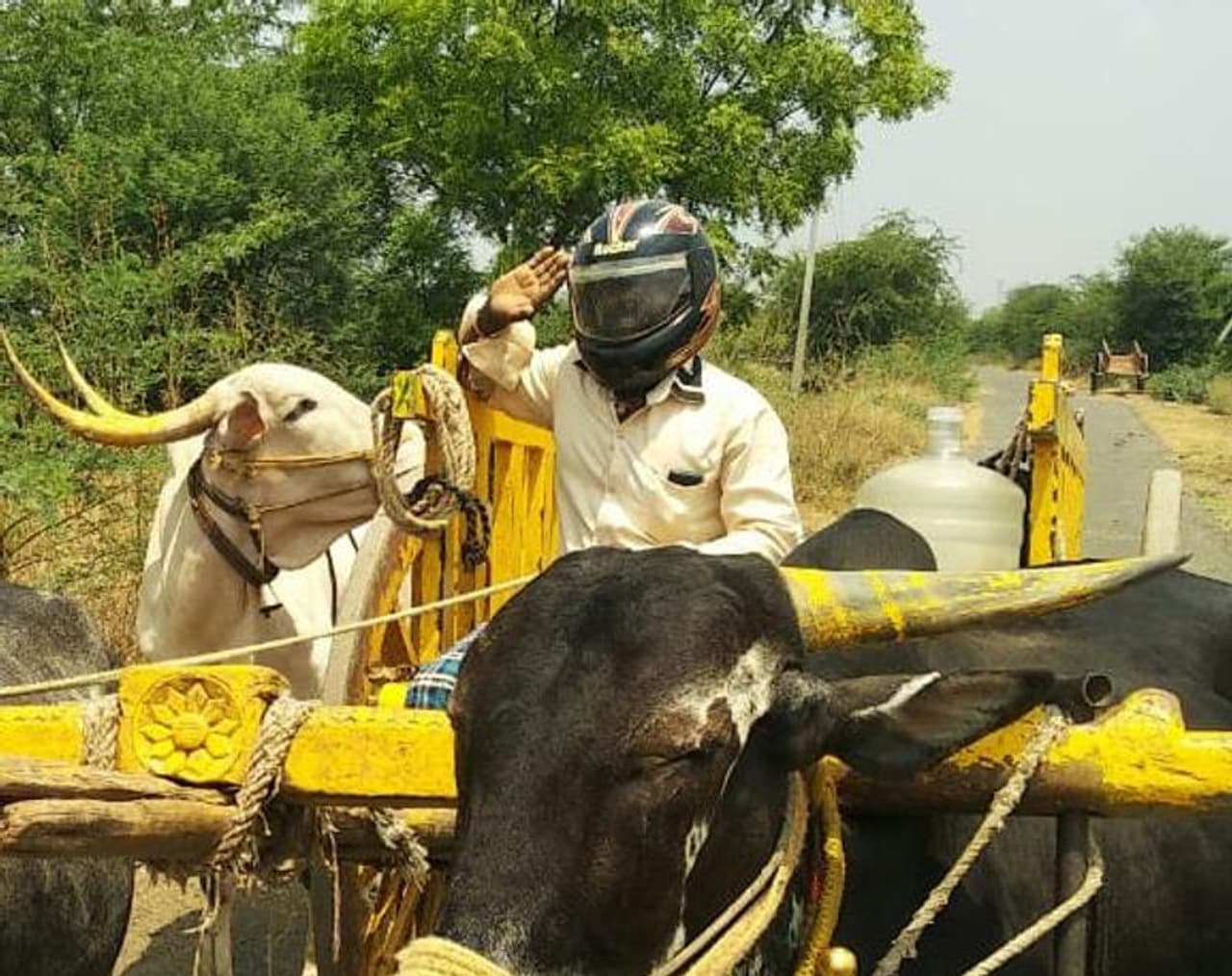 படித்தவர்களே கூட கொரோனா குறித்த விழிப்புணர்வு இல்லாமல் பொதுவெளியில் சுற்றுவதையும் அலட்சியமாக இருப்பதையும் பார்க்கமுடிகிறது. அப்படியிருக்கையில், கர்நாடக மாநிலம் கல்புர்க்கியில் விவசாயி ஒருவர், ஹெல்மெட் அணிந்து மாட்டுவண்டியில் சென்றுள்ளார். அவரை விசாரித்த போலீஸ் சப் இன்ஸ்பெக்டர், ஏன் ஹெல்மெட் அணிந்து செல்கிறீர்கள் என்று கேட்டதற்கு, கொரோனா முன்னெச்சரிக்கையாக ஹெல்மெட் அணிந்ததாக கூறியுள்ளார். அந்த விவசாயியின் விழிப்புணர்வையும் முன்னெச்சரிக்கையான செயல்பாட்டையும் கண்ட எஸ்.ஐ சுரேஷ் குமார், அவருக்கு சல்யூட் அடித்தார்.