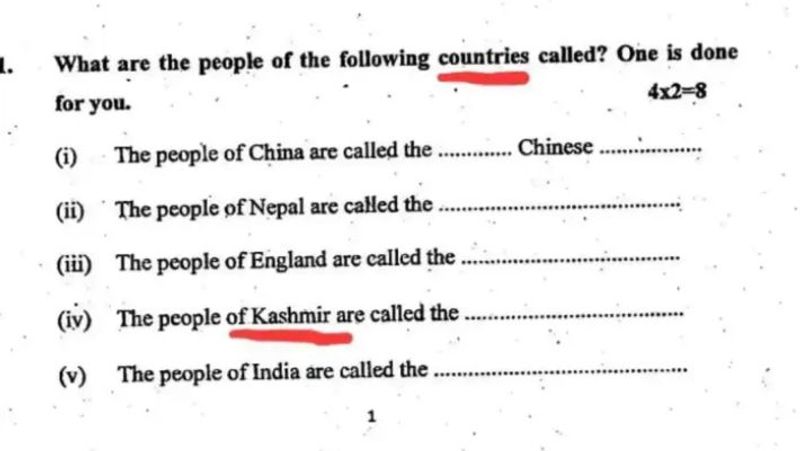 பீகார் மாநிலம் கிஷன்கஞ்ச் பகுதியில் உள்ள பள்ளியில் 7 ஆம் வகுப்பு மாணவர்களுக்கான தேர்வு நடைபெற்றது. இதில் ஆங்கில கேள்வித்தாளில் இடம்பெற்றிருந்த கேள்வி தான் தற்போது சர்ச்சையை கிளப்பி இருக்கிறது. அந்த கேள்வித்தாளில் சீனா, நேபாளம், இங்கிலாந்து, காஷ்மீர் மற்றும் இந்தியா ஆகிய நாடுகளில் வசிக்கும் மக்கள் எப்படி அழைக்கப்படுகிறார்கள் என்ற கேள்வி இடம்பெற்றிருந்தது.