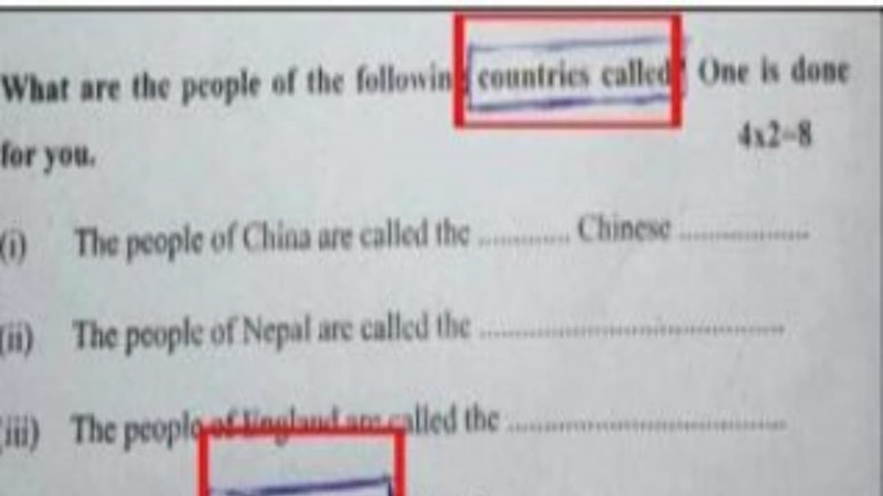 இதில், 7 ம் வகுப்பு மாணவர்களுக்கு வழங்கப்பட்ட வினாத்தாளில், கீழ்வரும் 5 நாடுகளில் வசிக்கும் மக்களை எப்படி அழைப்பார்கள் என கேட்கப்பட்டு, சீனா, நேபாளம், இங்கிலாந்து, காஷ்மீர், இந்தியா என குறிப்பிடப்பட்டுள்ளது.