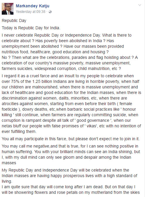 குடியரசு தினம் மற்றும் சுதந்திர தினம் உள்ளிட்டவற்றை கொண்டாட என்ன காரணம் இருக்கிறது? என கேள்வி எழுப்பியுள்ள மார்க்கண்டேய கட்ஜூ இந்தியாவில் வறுமை ஒழிக்கப்பட்டுள்ளதா?வேலையின்மை தீர்ந்து விட்டதா? நம் மக்கள் ஆரோக்கியமான உணவை உட்கொள்கின்றார்களா, அவர்களுக்கு