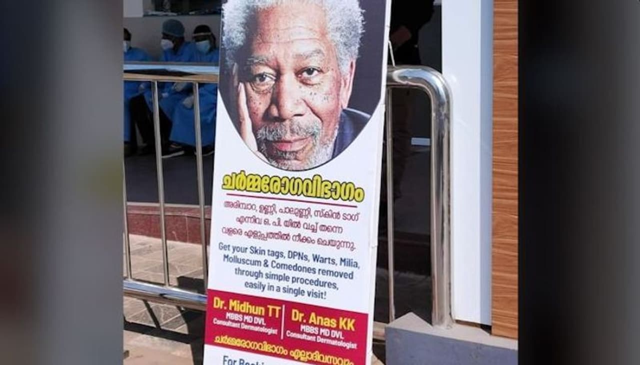 சருமப் பிரச்னைகளைத் தீர்ப்பதற்கான கேரள மருத்துவமனை விளம்பரப் பதாகையில் ஹாலிவுட் நடிகர் மார்கன் ஃப்ரீமேனின் படத்தை போட்டிருப்பது பெரும் சர்ச்சையை ஏற்படுத்தியுள்ளது.