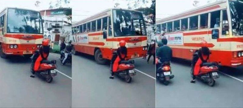 கேரள மாநிலத்தில் இருவழி பாதையில் சென்று கொண்டிருந்த அரசுப் பேருந்து ஒன்று திடீரென விதிமுறை கோட்டை மீறி தவறான பாதையில் வந்தது. இதனைத் தொடர்ந்து அந்தச் சாலை வழியே சரியான வழியில் இருசக்கர வாகனத்தில் சென்ற பெண் ஒருவர் பாதை மாறி வந்த பேருந்திற்கு வழிவிடாமல் தில்லாக நின்றார்.