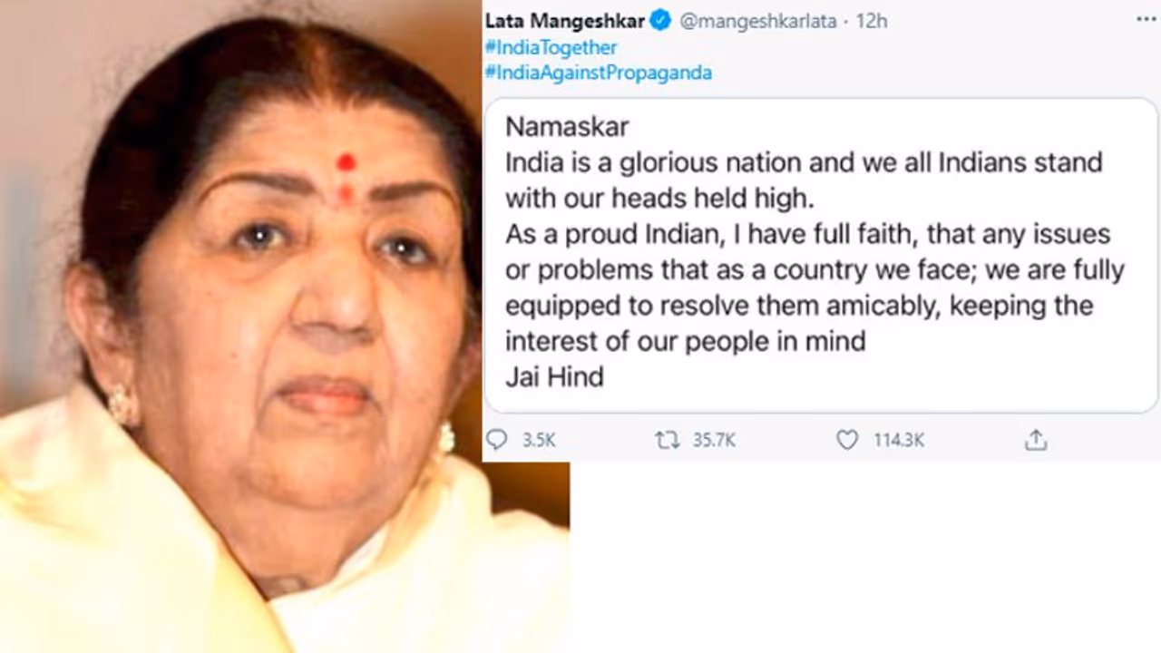 அந்தவகையில், இந்தியாவின் புகழ்பெற்ற பாடகியான லதா மங்கேஷ்கர், “இந்தியா போற்றத்தக்க மதிப்புமிகு நாடு. இந்தியாவில் என்ன பிரச்னையாக இருந்தாலும், அதை நாங்களே பார்த்துக்கொள்வோம். இதை ஒரு பெருமைமிகு இந்தியனாக என்னால் கூறமுடியும். எந்த பிரச்னைக்கும் இணக்கமான முறையில் தீர்வு காணும் தகுதி இந்தியாவிற்கு உள்ளது” என்று லதா மங்கேஷ்கர் தெரிவித்துள்ளார்.