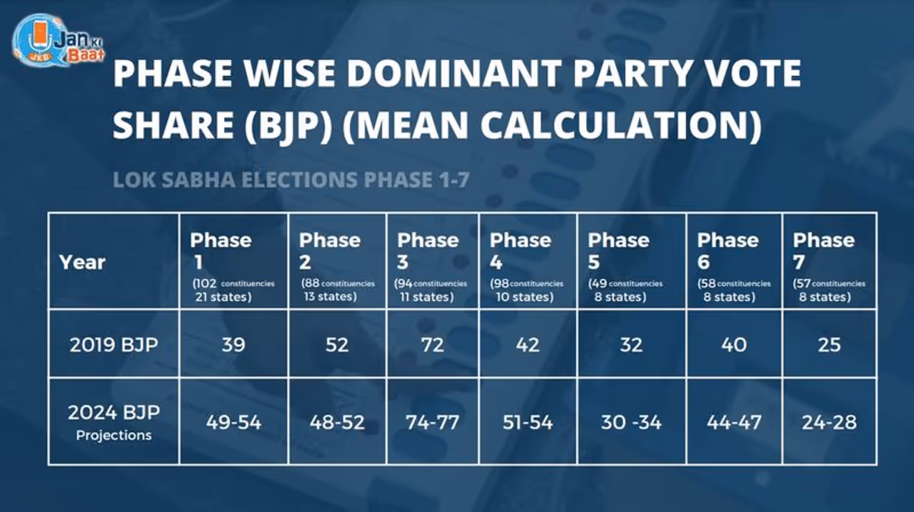 என்.டி.ஏ. கூட்டணிக்கு 50 சதவீதம் வாக்குகள், இந்தியா கூட்டணிக்கு 35 சதவீதம், மற்ற கட்சிகளுக்கு 15 சதவீதம் வாக்குகள் கிடைக்கும் என்று தெரிவித்துள்ளது. பாஜகவுக்கு மட்டும் 42 சதவீதம் வாக்குகள் கிடைக்கும். இந்தியாவில் 18 சதவீதம் வாக்குகள் கிடைக்கும் எனக் கூறப்பட்டுள்ளது.