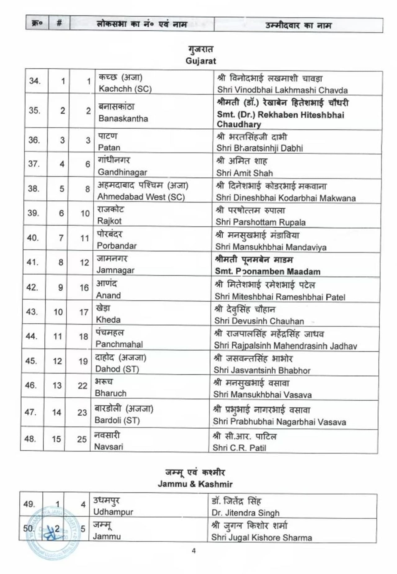 உத்தரப் பிரதேசத்தில் 51 மக்களவைத் தொகுதிகளுக்கும், மேற்கு வங்கத்தில் 20 இடங்களுக்கும், டெல்லியில் 5 இடங்களுக்கும், கோவா மற்றும் திரிபுராவில் தலா ஒன்று மற்றும் 16 மாநிலங்கள் மற்றும் யூனியன் பிரதேசங்களுக்கான வேட்பாளர்களை பாஜக அறிவித்துள்ளது. 28 பெண்கள் மற்றும் 50 வயதுக்குட்பட்ட 47 வேட்பாளர்களுக்கு டிக்கெட் வழங்கப்பட்டதால், பெண்கள் மற்றும் இளம் தலைவர்கள் மீது கட்சியின் முக்கியத்துவம் வெளிப்பட்டுள்ளது. இரண்டு முன்னாள் முதல்வர்களும் எதிர்வரும் தேர்தலில் போட்டியிடுகின்றனர்.